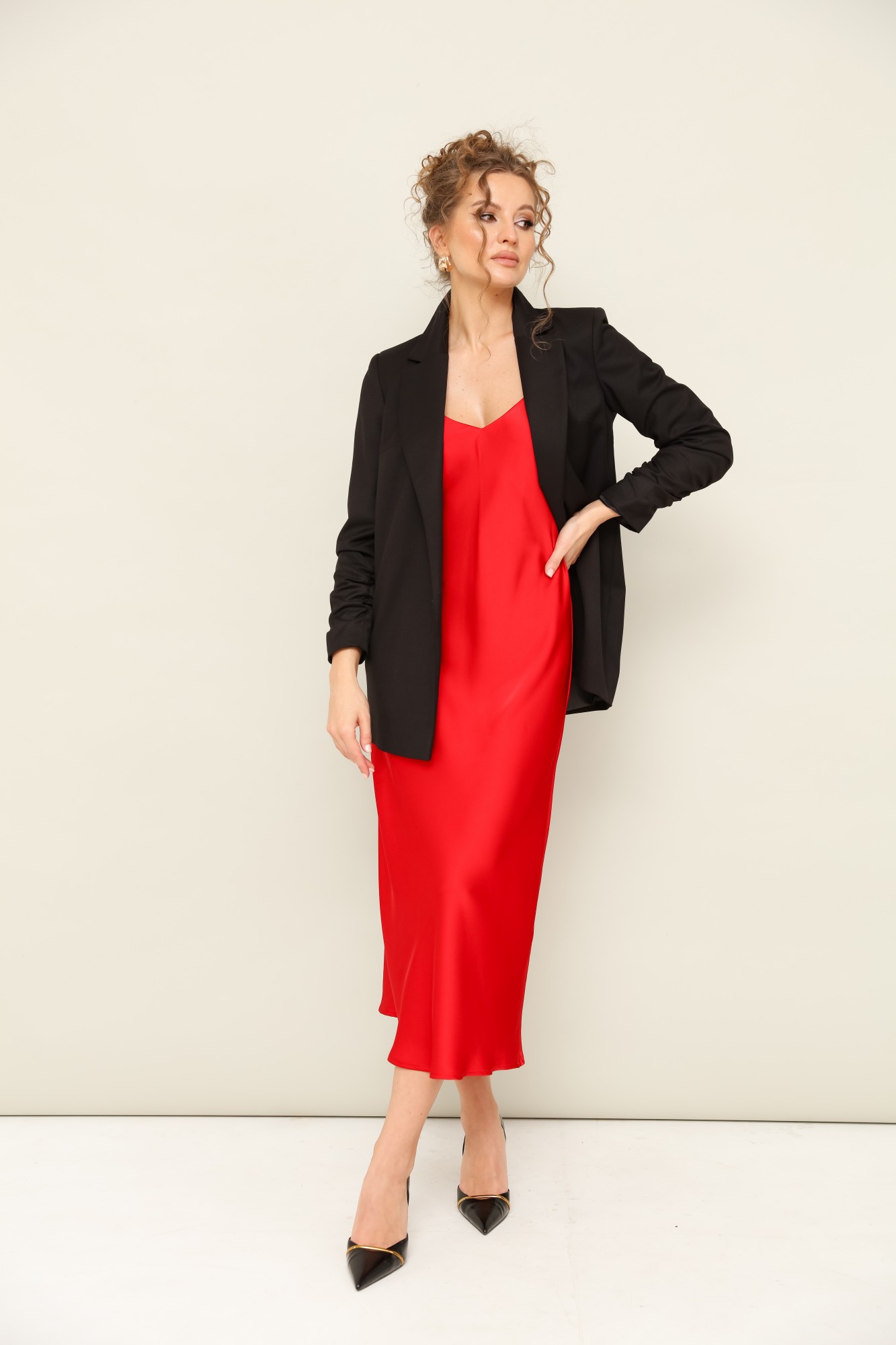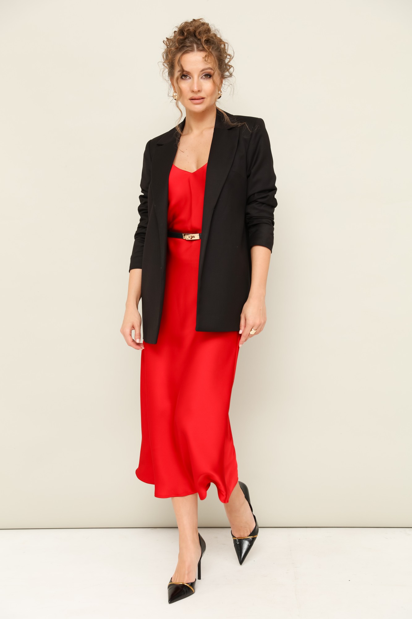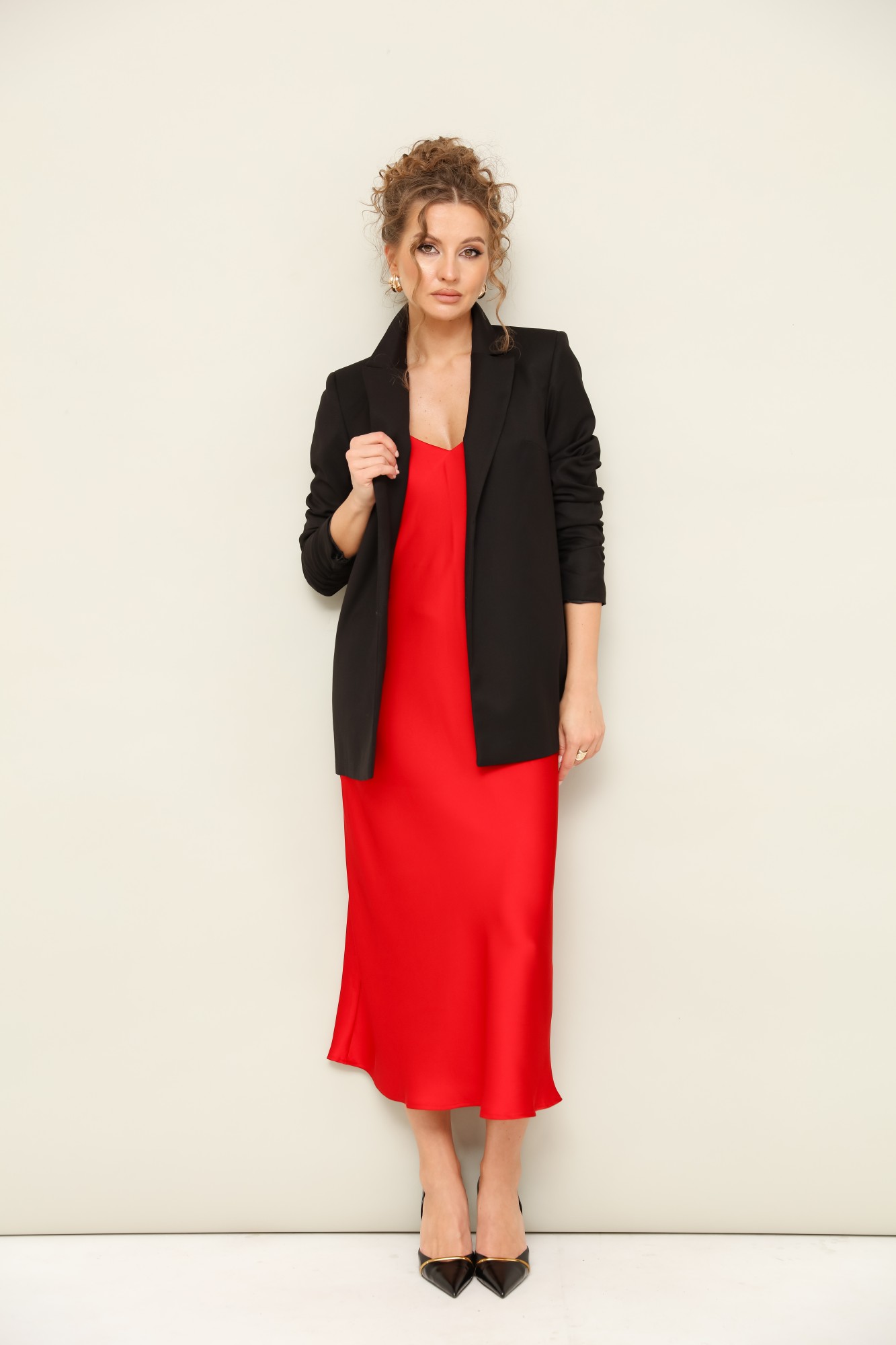 Жакет – полиэстер 78%, вискоза 18%, спандекс 4%. Платье – полиэстер 100%