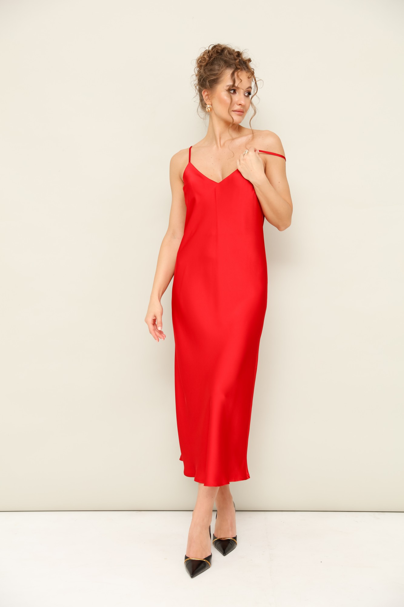 Платье-комбинация полуприлегающего силуэта, на регулируемых бретелях.