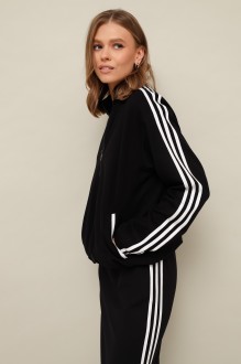 Костюм в стиле спорт-шик, выполнен из качественного трикотажого нейлона. Бомбер свободного кроя. Горловина с воротником-стойкой. Центральная застежка на тесьму-молнию. Спереди обработаны наклонные карманы-листочки. Рукава длинные, со спущенной линией втачивания плеча с манжетой на резинке. Низ бомбера собирается на эластичную тесьму с регулятором для формирования силуэта. Платье полуприлегающего силуэта в длине миди. Округлый вырез горловины. В боковом шве обработан высокий разрез. По плечевому шву, рукавам, карманам бомбера и боковым швам платья настрочен декоративный элемент в виде хлопковой тесьмы контрастного цвета.