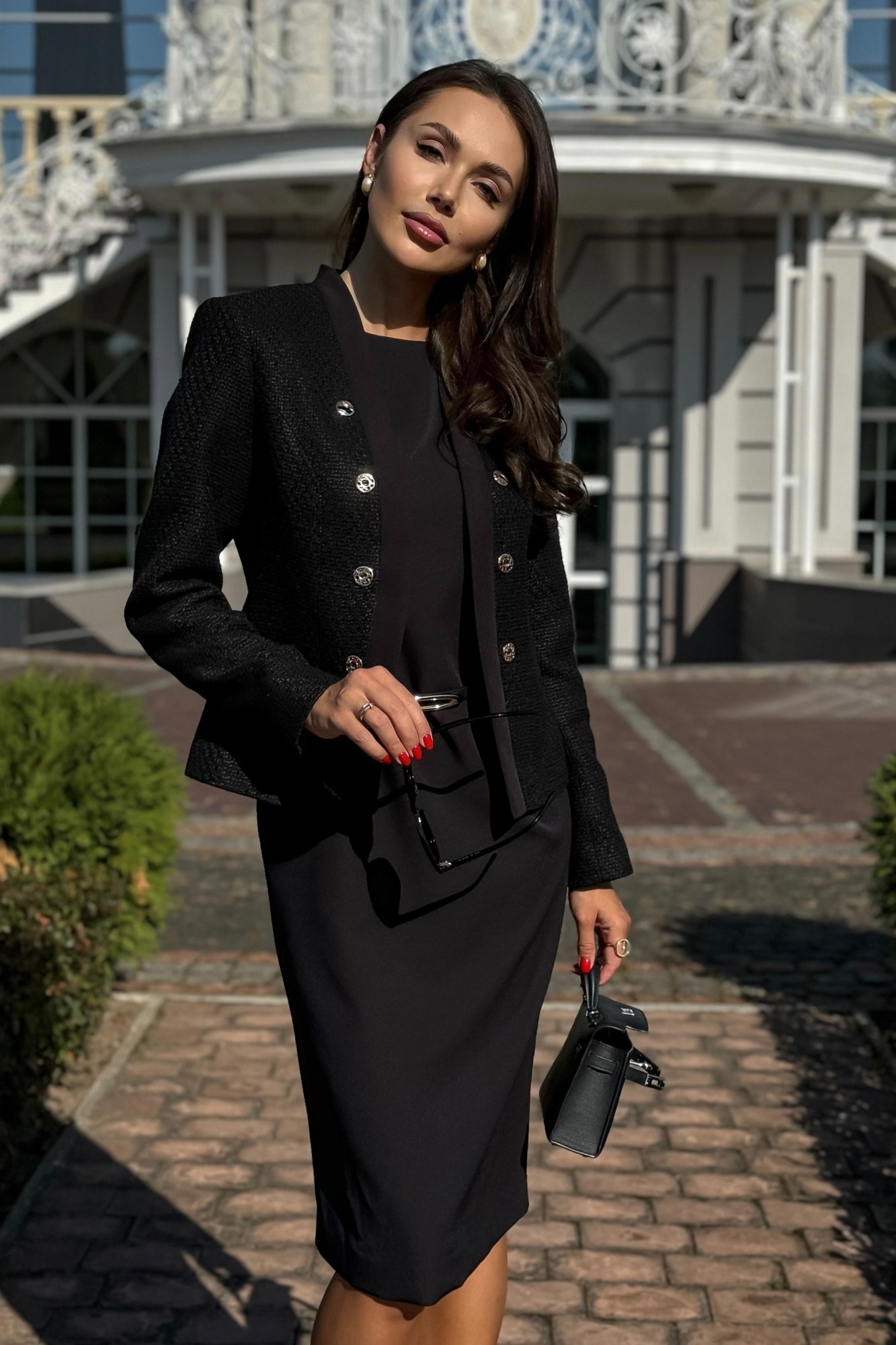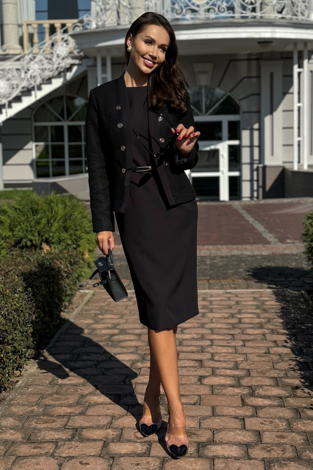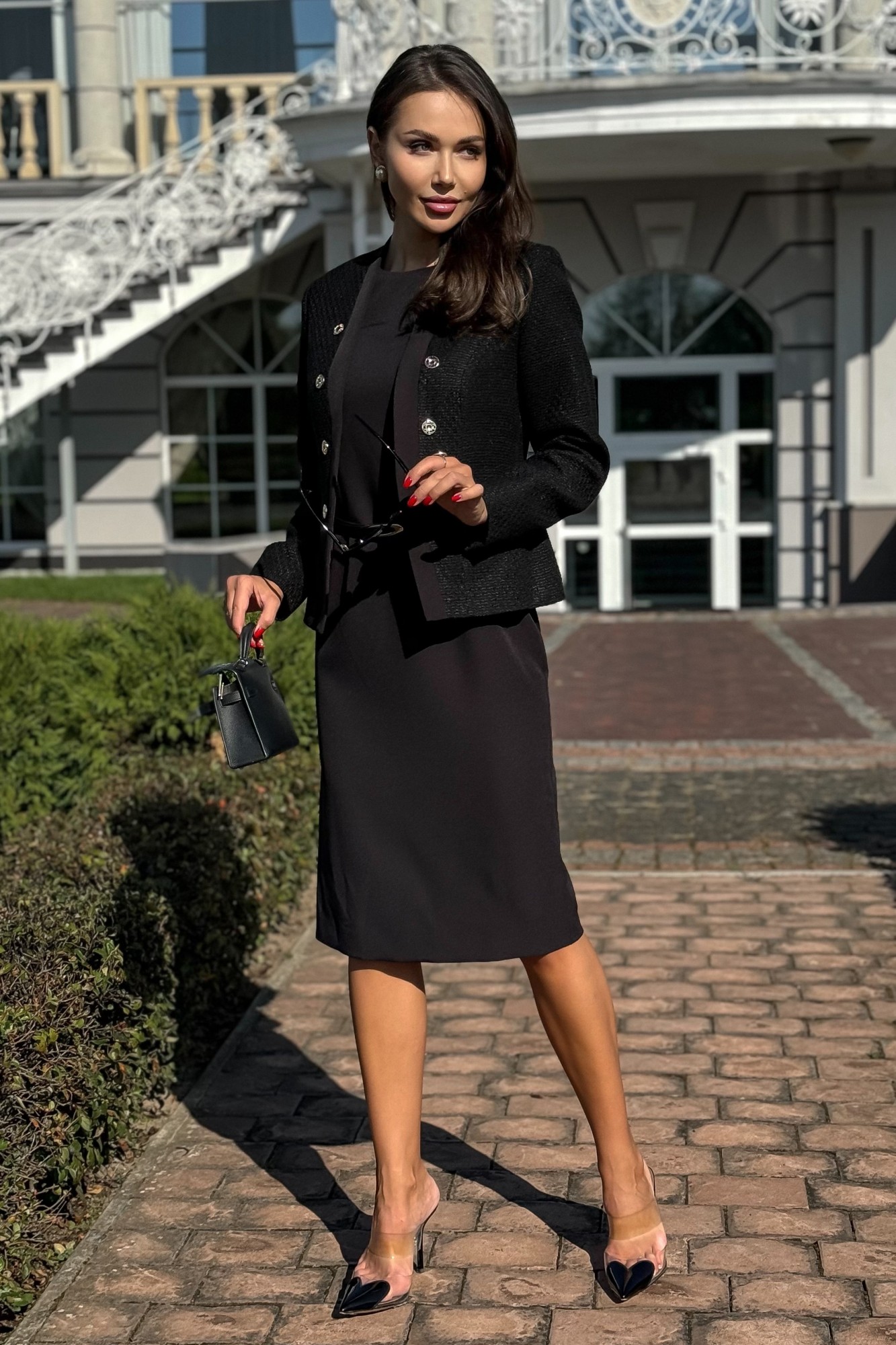 платье: полиэстер - 79%, вискоза 12%, спандекс - 9%. Состав жакета: акрил - 50%,полиэстер - 29%, вискоза - 21%.