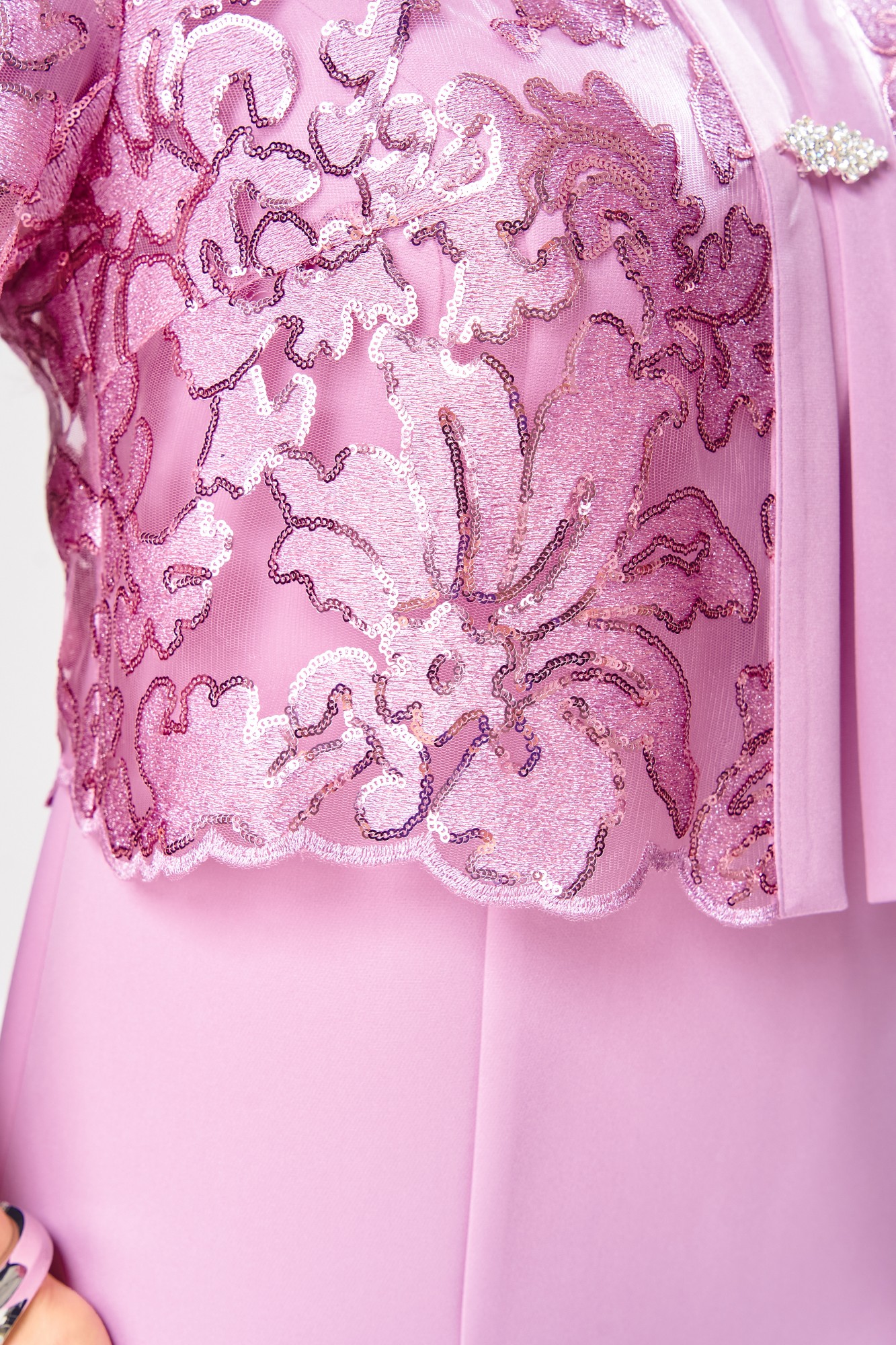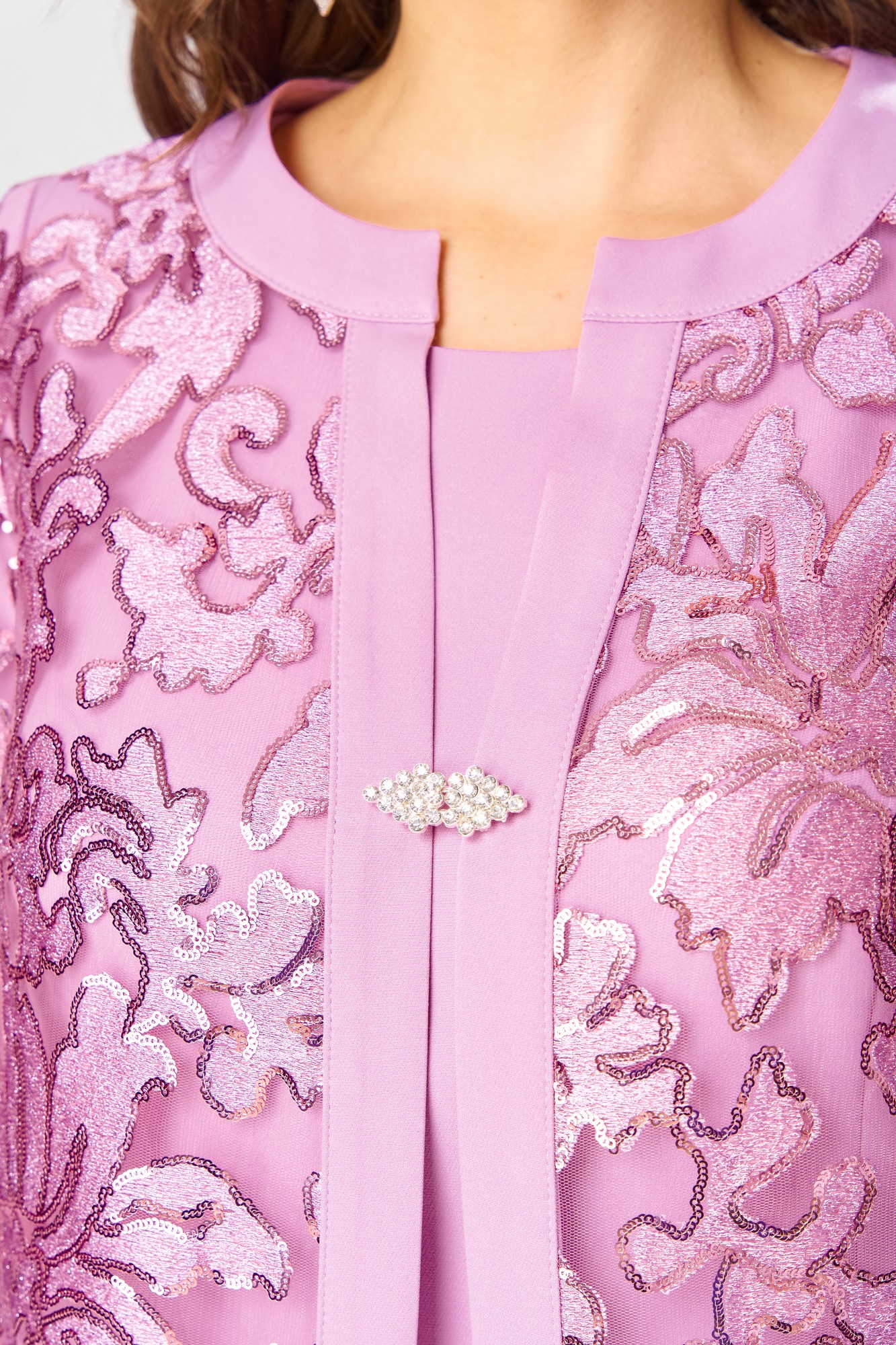 Комплект женский, относится к торжественно-нарядной одежде. Комплект женский, 2-х предметный, жакет и платье. Жакет женский прямого силуэта, длиной до линии талии, выполнен из кружевного полотна. Перед с 2-мя нагрудными вытачками, с 2-мя притачными вертикальными планками, с притачными планками по горловине. Спинка с притачной планкой по горловине. Горловина круглая, обточная, без воротника. Застёжка на декоративный пришивной крючок. Рукав втачной одно шовный, длиной 3/4 с притачной манжетой. Жакет без плечевых накладок. Платье женской длиной за колено, полу прилегающего силуэта. Перед с 2-мя отрезными бочками. Спинка с 2-мя таллиевыми вытачками, со средним швом, заканчивающимся шлицей. Горловина круглая, обточная, без воротника. Застёжка на потайную тесьму-молнию в среднем шве спинки. Рукав втачной, короткий, одно шовный. Платье с плечевыми накладками.