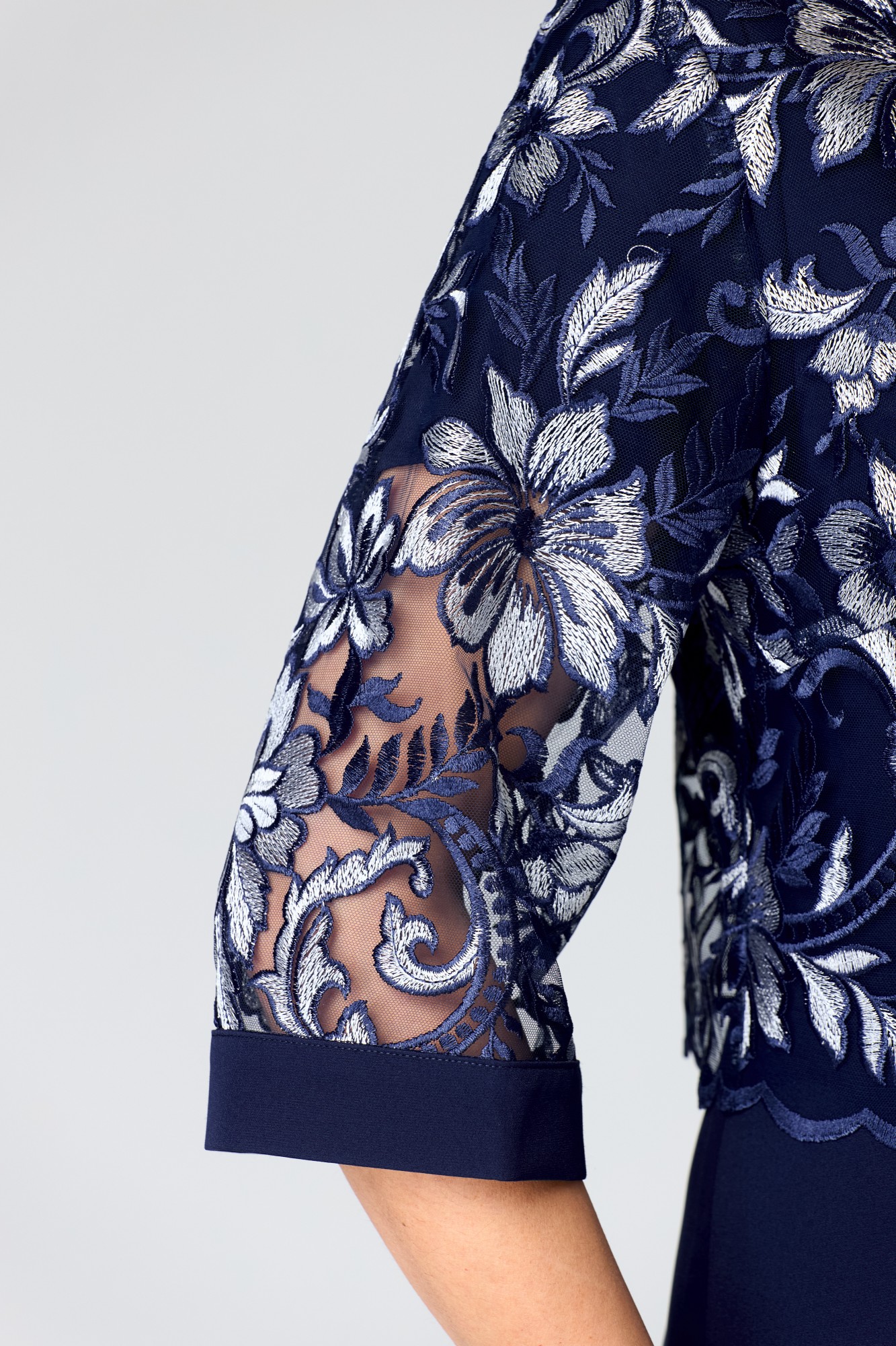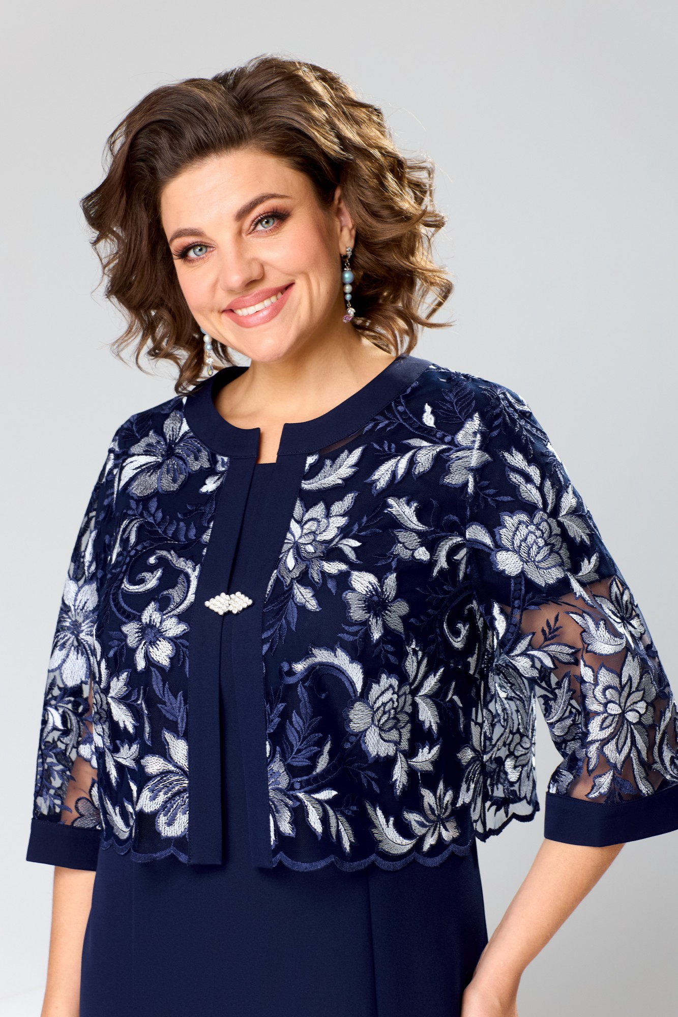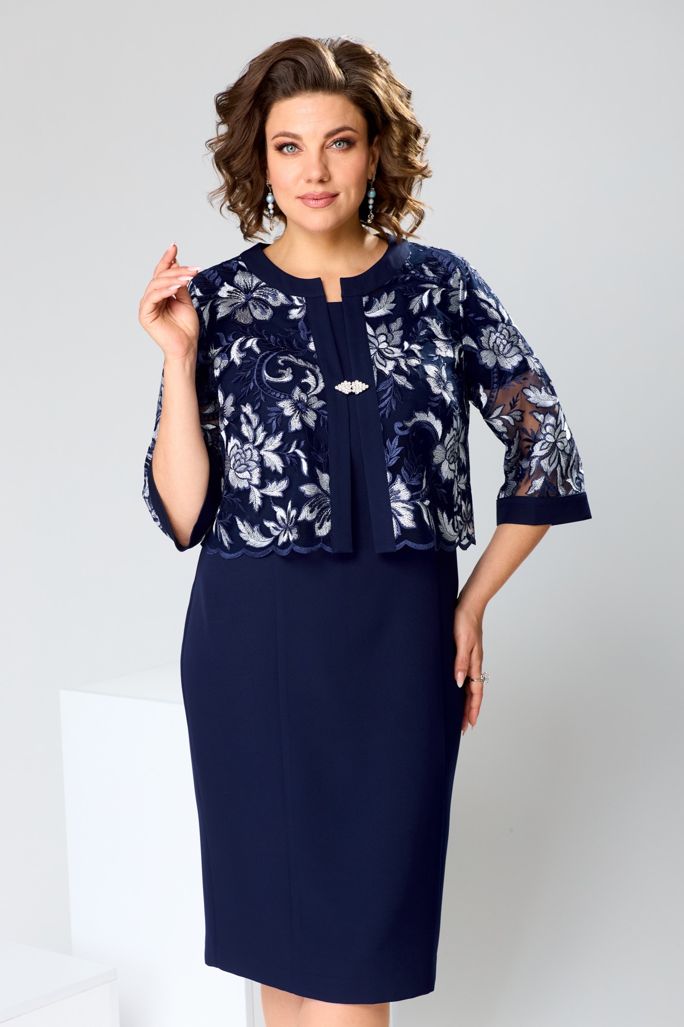Комплект женский, относится к торжественно-нарядной одежде. Комплект женский, 2-х предметный, жакет и платье. Жакет женский прямого силуэта, длиной до линии талии, выполнен из кружевного полотна. Перед с 2-мя нагрудными вытачками, с 2-мя притачными вертикальными планками, с притачными планками по горловине. Спинка с притачной планкой по горловине. Горловина круглая, обточная, без воротника. Застёжка на декоративный пришивной крючок. Рукав втачной одно шовный, длиной 3/4 с притачной манжетой. Жакет без плечевых накладок. Платье женской длиной за колено, полу прилегающего силуэта. Перед с 2-мя отрезными бочками. Спинка с 2-мя таллиевыми вытачками, со средним швом, заканчивающимся шлицей. Горловина круглая, обточная, без воротника. Застёжка на потайную тесьму-молнию в среднем шве спинки. Рукав втачной, короткий, одно шовный. Платье с плечевыми накладками.