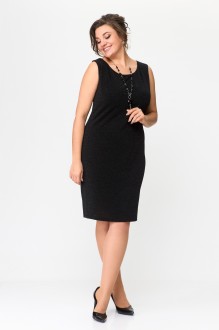 Жакет прямого силуэта. Спинка прямая. Полочка с нагрудной косой вытачкой. По переду действующие карманы (листочка). Рукав 7/8, по центру рукава вставка из сетки и ткани в пайетки. Воротник лацканы, застежка на пуговицах. Жакет без подкладки. Платье черного цвета полуприлегающего силуэта из трикотажной ткани с прозрачной нитью, которая создает эффект мерцания. Вырез полукруглый, по полочке нагрудные вытачки, спинка прямая.