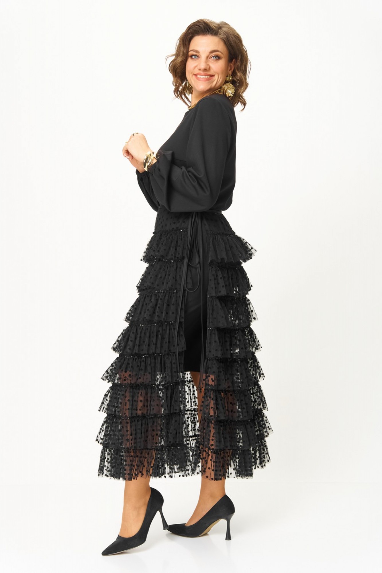 Комплект женский двухпредметный состоящий из платья и юбки. Платье полуприлегающего силуэта с втачным рукавом, станет идеальным выбором для создания стильного и комфортного образа. Горловина округлой формы. Застежка по спинке на воздушную петлю и пуговицу. По переду вытачки по линии груди. Спинка со средним швом и разрезом по низу. Рукав длинный объемный к низу с эластичной тесьмой. Юбка легкая и воздушная из сетки с отделкой из пайетки на завязке по талии, с высоким разрезом сбоку, отлично будет смотреться и отдельно в сочетании с брюками.