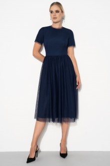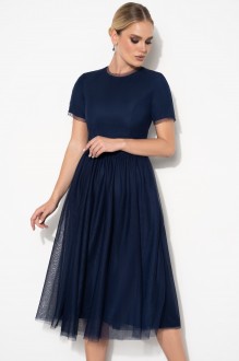 Платье женское многослойное, с притачной по горловине и низу рукава узкой отделочной деталью из сетки, силуэта песочные часы, отрезное по линии талии, длиной миди. Верхний слой платья из отделочного материала - сетка, нижний слой - легкая плательная ткань. Верхняя часть переда и спинки (лиф) с рельефами, выходящими из проймы и идущими до линии талии. Нижняя часть платья (юбка) многослойная, расклешенная книзу. Верхний слой юбки состоит из двух слоев сетки. В шве притачивания юбки к лифу - сборка. Спинка платья со средним швом, в котором обработана застежка на потайную тесьму-молнию. Рукава втачные одношовные, короткие. Горловина круглой формы обтачная.