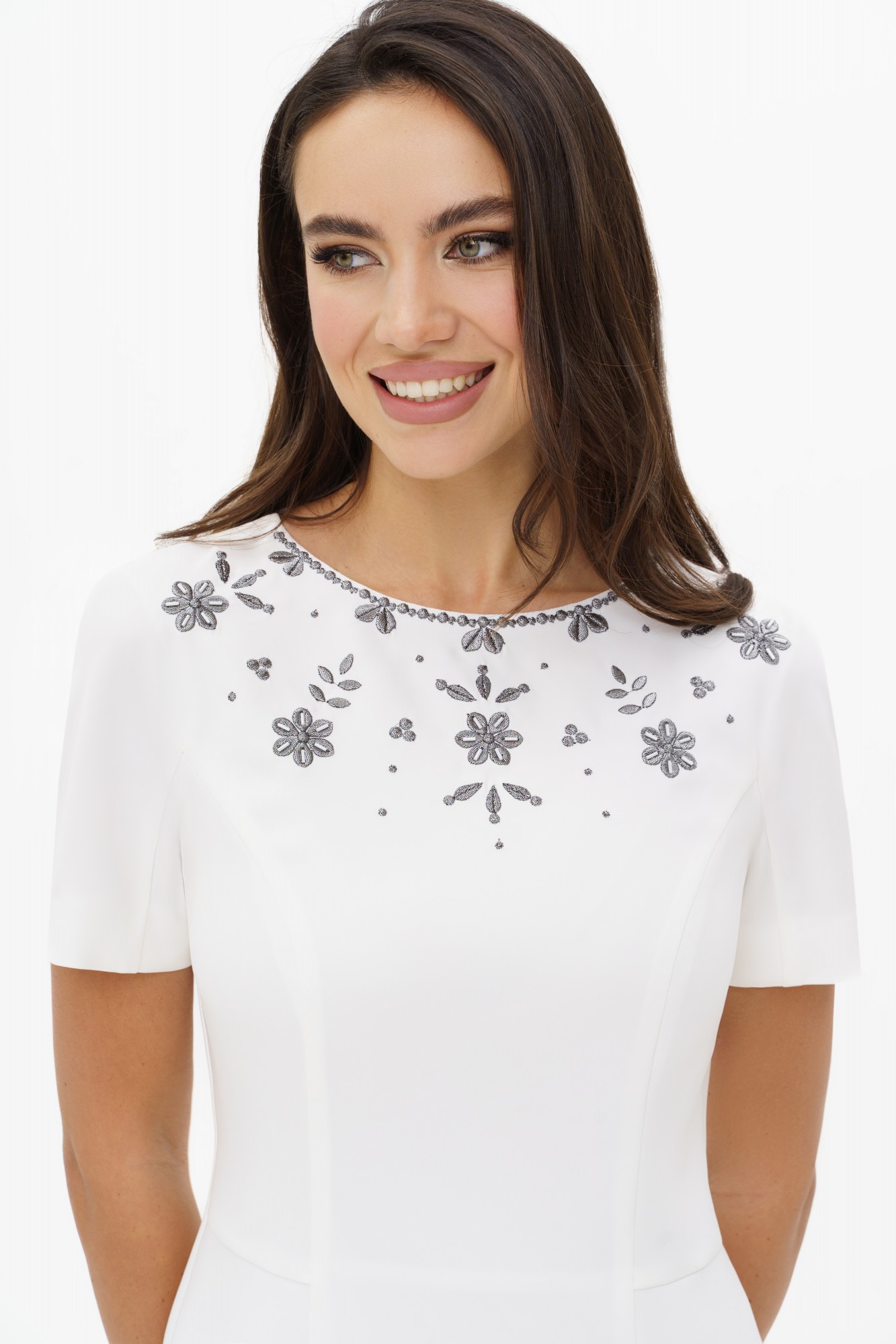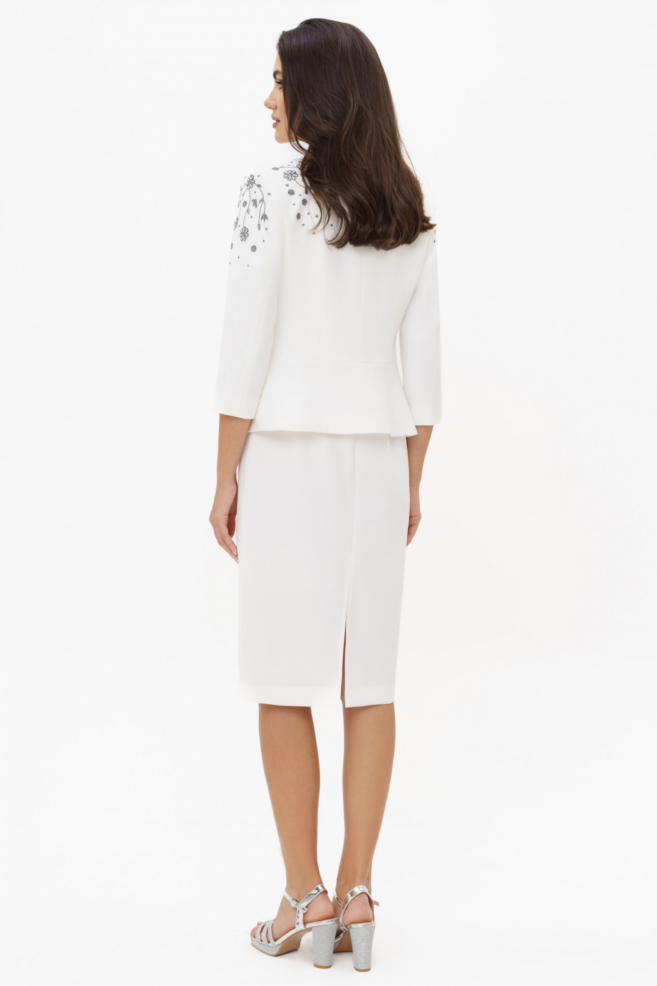 Средняя длина: по среднему шву спинки жакета - 55,0 см (±2,0 см), средняя длина рукава - 47,0 см (±2,0 см). Средняя длина по среднему шву спинки платья - 106,0 (±2,0 см).
