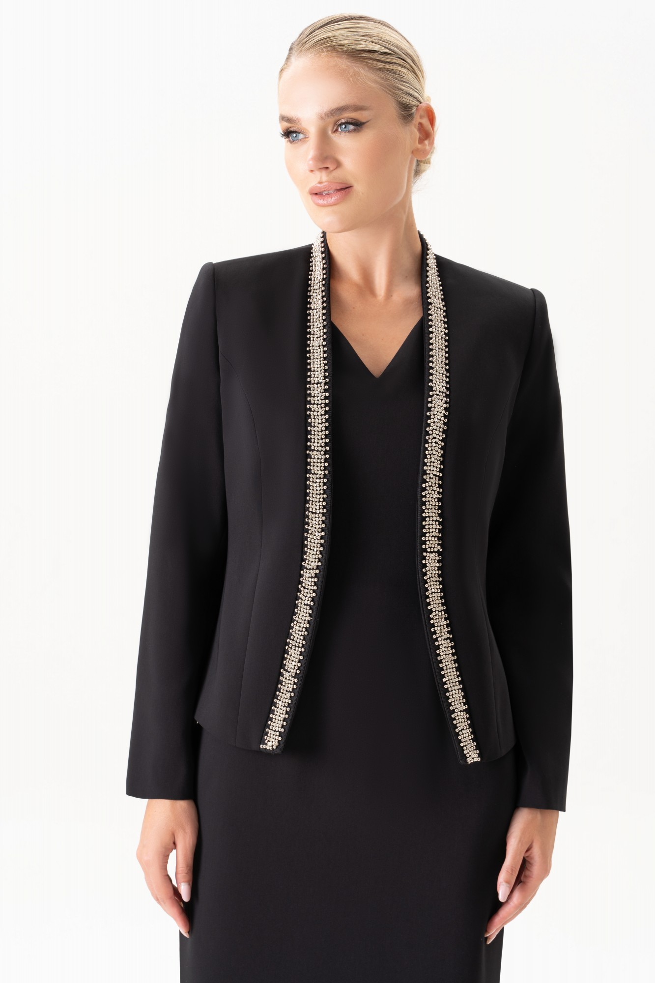 Классический костюм-двойка, очень удобный и элегантный. Жакет с идеальной посадкой, дополненный изысканной цепочной отделкой по лацканам, придает образу нотку благородства. Этот костюм — идеальный выбор для делового ужина, торжественного мероприятия или официальной встречи. Завершите образ минималистичными аксессуарами и классическими туфлями на каблуке для создания безупречного впечатления. Костюм женский 2-х предметный, состоящий из жакета и платья, выполненных из костюмно-плательной ткани. Костюм нарядный. Жакет полуприлегающего силуэта, на подкладке, без застежки, встык, по переду с V- образной горловиной и с притачными планками, переходящими в воротник - стойку по спинке. Притачные планки переда и воротник-стойка по спинке декорированы отделочной тесьмой с нашитыми на сетку бусинами и камешками (размер и цвет фурнитуры может незначительно отличаться от фото). Перед с рельефными швами, проходящими через центр груди, идущими от пройм до низа, с наклонной линией низа и расходящимися к низу бортами. Спинка со средним швом, с рельефами, идущими от пройм до низа. Рукава втачные, двухшовные, длинные. Жакет с плечевыми накладками. Платье прилегающего силуэта, зауженное к низу, перед и спинка на трикотажной, отлетной по низу подкладке. Перед с полурельефами, идущие от пройм, проходящие через центр груди и уходящие вниз в таллиевые вытачки, с отрезными бочками по линии талии. Спинка с таллиевыми вытачками, со средним швом, в верхней части которого обработана застежка на потайную тесьму-молнию, в нижней части – разрез. Рукава цельнокроеные с отрезной нижней частью рукава. Горловина переда и спинки обтачная подкладкой, по переду V- образная углубленная.