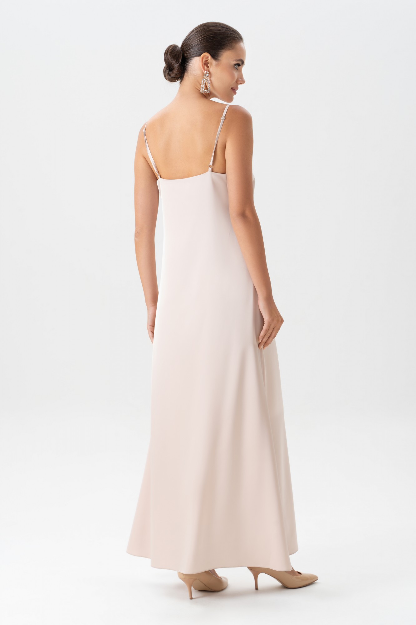 Нарядный женский костюм с платьем от брендов URS — это утончённый праздничный комплект, созданный для тех, кто выбирает изысканность, благородство и проверенную временем классику. Такой вечерний костюм прекрасно вписывается в атмосферу торжества, подчеркивает женственность и обеспечивает комфорт на протяжении всего события. Костюм женский, состоящий из блузона и платья, выполненных из плательной атласной ткани, нарядный. Блузон прямого силуэта, укороченный, с цельнокроеными короткими рукавами, с застежкой по спинке до верха на разъёмную тесьму-молнию с металлическими звеньями. Блузон также можно одевать застежкой на перед. Перед и спинка с цельнокроеным бочком. Рукава цельнокроеные короткие, с притачной нижней частью. Горловина блузона - круглая лодочка, застегивающаяся по спинке на пришивной потайной крючок. Низ переда, спинки и рукавов, горловина, застежка спинки вдоль молнии декорированы отделочной тесьмой из сетки с нашивными бусинами (размер и цвет фурнитуры может незначительно отличаться от фото). Перед, спинка и рукава на подкладке. Платье полуприлегающего силуэта, на бретелях, слегка расклешенное к низу, длинное, на отлетной по низу подкладке. Перед с нагрудными вытачками, выходящими из боковых швов. Верхняя часть переда ˅- образная, углубленная.