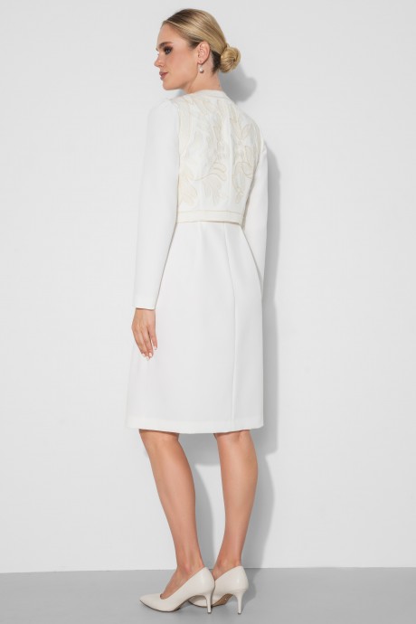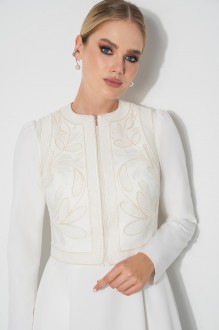 "Этот универсальный, красивый и необычайно женственный костюм с дизайнерской вышивкой, сделает Ваш образ стильным, запоминающимся и лаконичным. Костюм женский состоит из короткого жилета прилегающего силуэта с декоративной вышивкой по полочкам и спинке и платья с отрезной талиее длиной миди. Жилет женский на притачной подкладке с центральной застежкой встык, в шве которого расположена разъемная молния. Полочки с нагрудными вытачками. Спинка со средним швом и талиевыми вытачками. Горловина круглая, обтачная. Проймы обтачные.