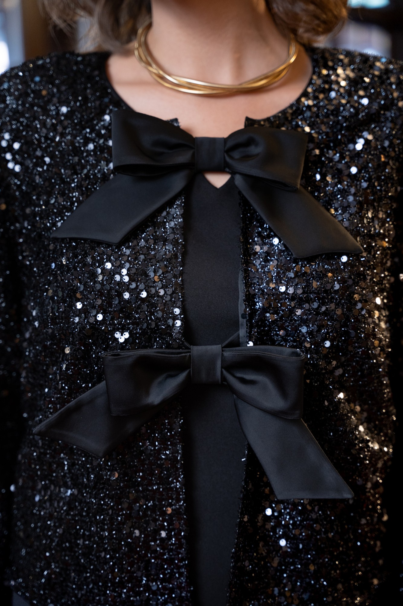 Комплект женский состоит из укороченного жакета из полотна с пайетками и атласного платья. Жакет прямого силуэта свободного покроя с естественной линией плеча на подкладке из атласной ткани. Горловина округлой формы. БАНТЫ СЪЁМНЫЕ! Застежка на съемные декоративные авторские банты с применением потайного крепления на небольшие кнопки, для возможности создания различных образов, как с бантами, так и без них. Платье женское полуприлегающего силуэта с естественной линией плеча. Рукав короткий втачной одношовный. Горловина оригинальной авторской формы. По переду выполнены полурельефы выходящие из пройм. Спинка с вытачками. В среднем шве спинки застежка на потайную тесьму-молнию и шлица.