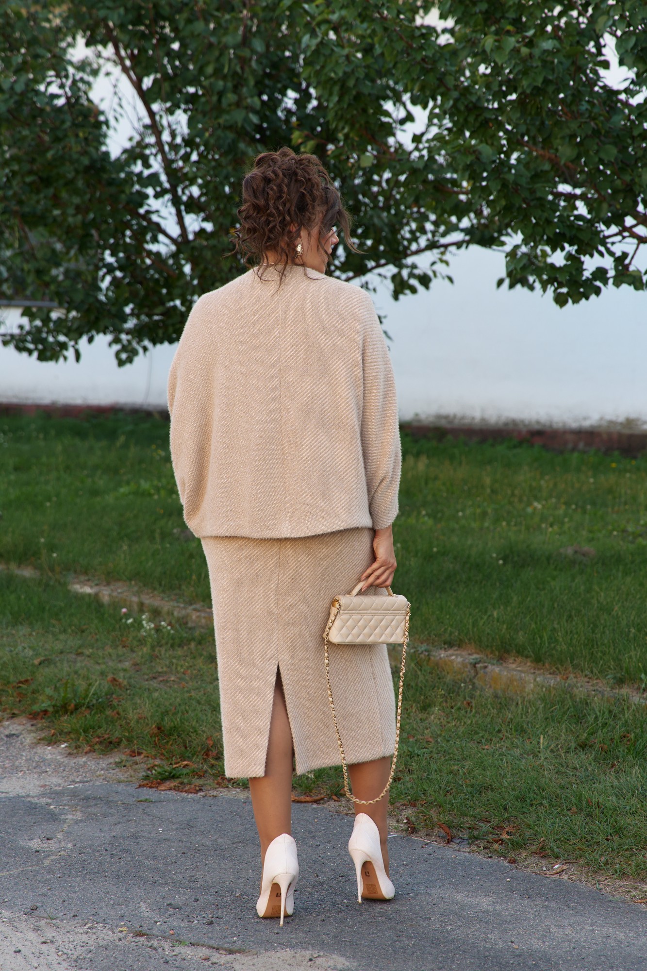Комплект женский состоящий из жакета и платья. Жакет «оверсайз» свободного силуэта, с центральной застёжкой на потайные кнопки по краю борта. Горловина в жакете округлой формы с прилегающим воротником-стойкой. Рукав по форме летучая-мышь с фигурной линией низа. По переду платья рельеф уходящий в рукав. Спинка со средним швом. Боковые швы жакета переходят на перёд. В качестве дополнительного декоративного элемента по краю борта жакета декоративные украшения в виде брошек.