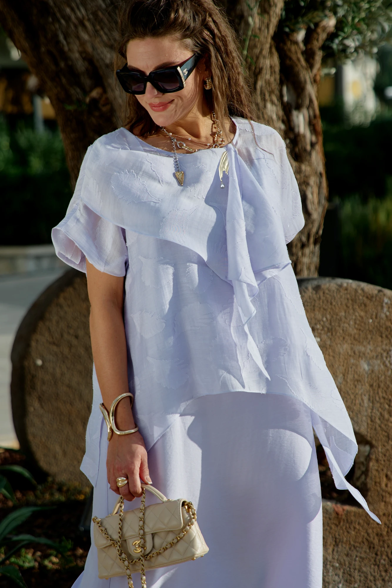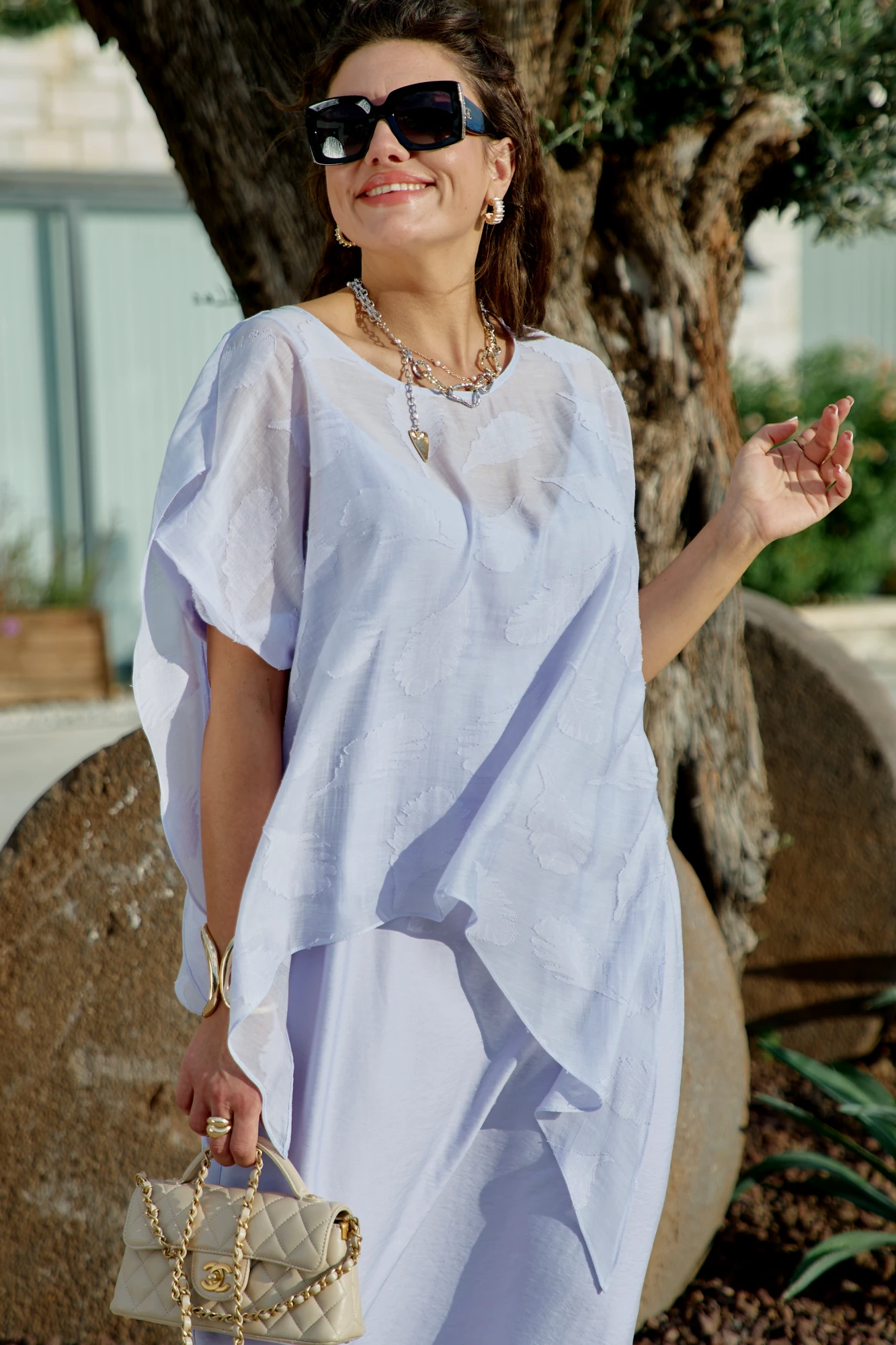 Комплект женский, двух предметный, состоящий из блузы и платья. Этот комплект — метафора современной женщины: она имеет прочное основание (однотонное платье), но не боится проявлять тонкость, сложность, многослойность (туника с фактурным принтом). Она практична, но мечтательна; устойчива, но легка; понятна, но загадочна. Два элемента создают многослойный образ, где каждая ткань рассказывает свою часть истории, а вместе они складываются в совершенную гармонию. Комплект учит нас, что монохром — не значит скучно. Один цвет, но бесконечное разнообразие фактур, плотностей, прозрачностей. Контраст создает глубину образа, где каждый слой играет свою роль. Состав: блуза 70% вискоза, 30% полиэстер, платье 80% вискоза, 20% па. Блуза это второй слой, полупрозрачная вуаль, наброшенная на платье. Ее короткий рукав и свободный крой создают ощущение невесомости. Горловина в блузе округлой формы. По переду блузы отлетная деталь, которую можно фиксировать декоративной драпировкой при помощи броши по переду. Низ в блузе ассиметричный, в боковых швах разрезы. Полупрозрачность блузы позволяет увидеть силуэт платья, но смягчить его контуры. Платье прямой крой длины миди — это классика, которая льстит любой фигуре. Он не обтягивает, но и не скрывает — он следует естественным линиям тела, создавая ощущение легкости и свободы. Длина до середины икры — одновременно скромная и женственная, позволяющая двигаться с грацией. Платье на регулируемый бретелях. По спинке вставка эластичной тесьмы-резинки, которая обеспечивает комфортное прилегание. В среднем шве спинки разрез.