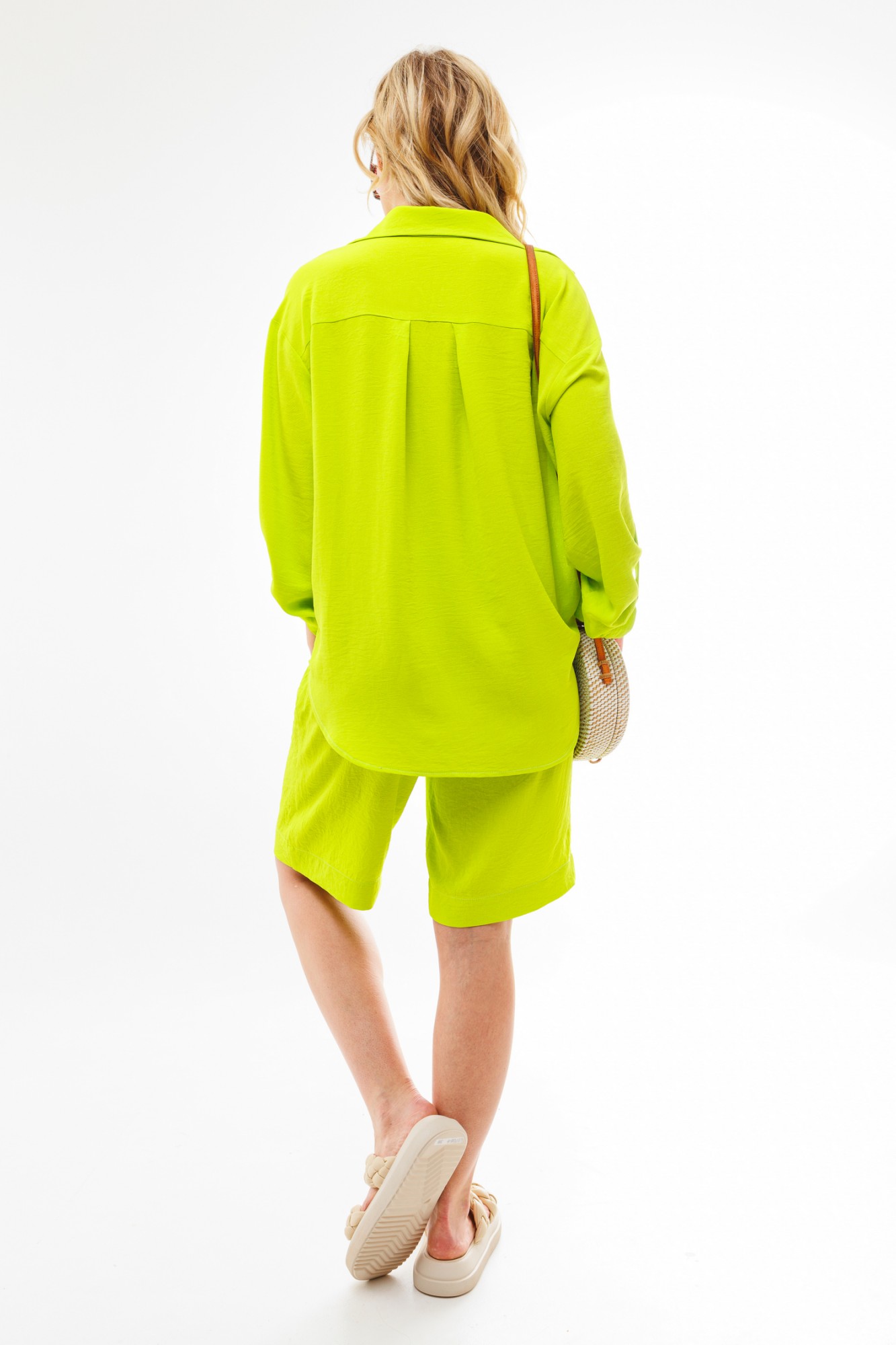 Рубашка свободногго силуэта,с центроально бортовой застежкой по переду на петли пуговицы.Воротник отложной стойка.По переду на линии груди накладные карман.Спинка с кокеткой, Рукав длинный на пате.Шорты свободного силуэта с притачным поясом на резинке .