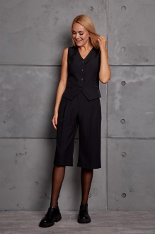 Комплект женский, состоящий из жакета, жилета, брюк-бермудов. Жакет прямого силуэта с втачным рукавом, свободный, с отложным воротником с лацканами с застёжкой на пуговицу, с карманами по переду, на подкладке. Жилет прилегающего силуэта с вертикальными рельефами по переду и спинке, с застёжкой спереди на пуговицы, на подкладке. Брюки- бермуды на поясе, свободные со складками по передним половинкам, с боковыми карманами, длина за колено.