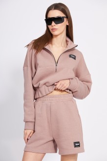"Комплект: джемпер + шорты. Комплект выполнен из трикотажного полотна. Джемпер свободного силуэта, длиной чуть ниже линии талии, на поясе с эластичной тесьмой. Спереди накладной карман. Застежка на молнию спереди от кармана до верха. Спинка цельная. Воротник-стойка. Плечевой шов спущен. Рукав рубашечного покроя, одношовный. Низ рукава на манжете. Джемпер декорирован нашивкой. Шорты свободного покроя, на притачном поясе с эластичной тесьмой. Спереди боковые карманы с наклонным входом. Шорты декорированы нашивкой.