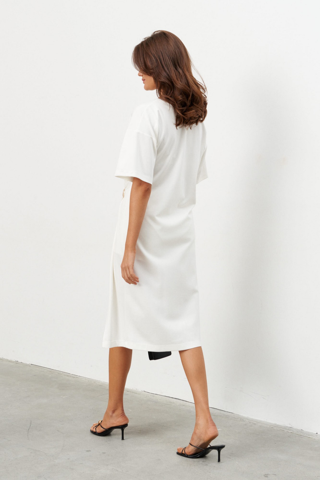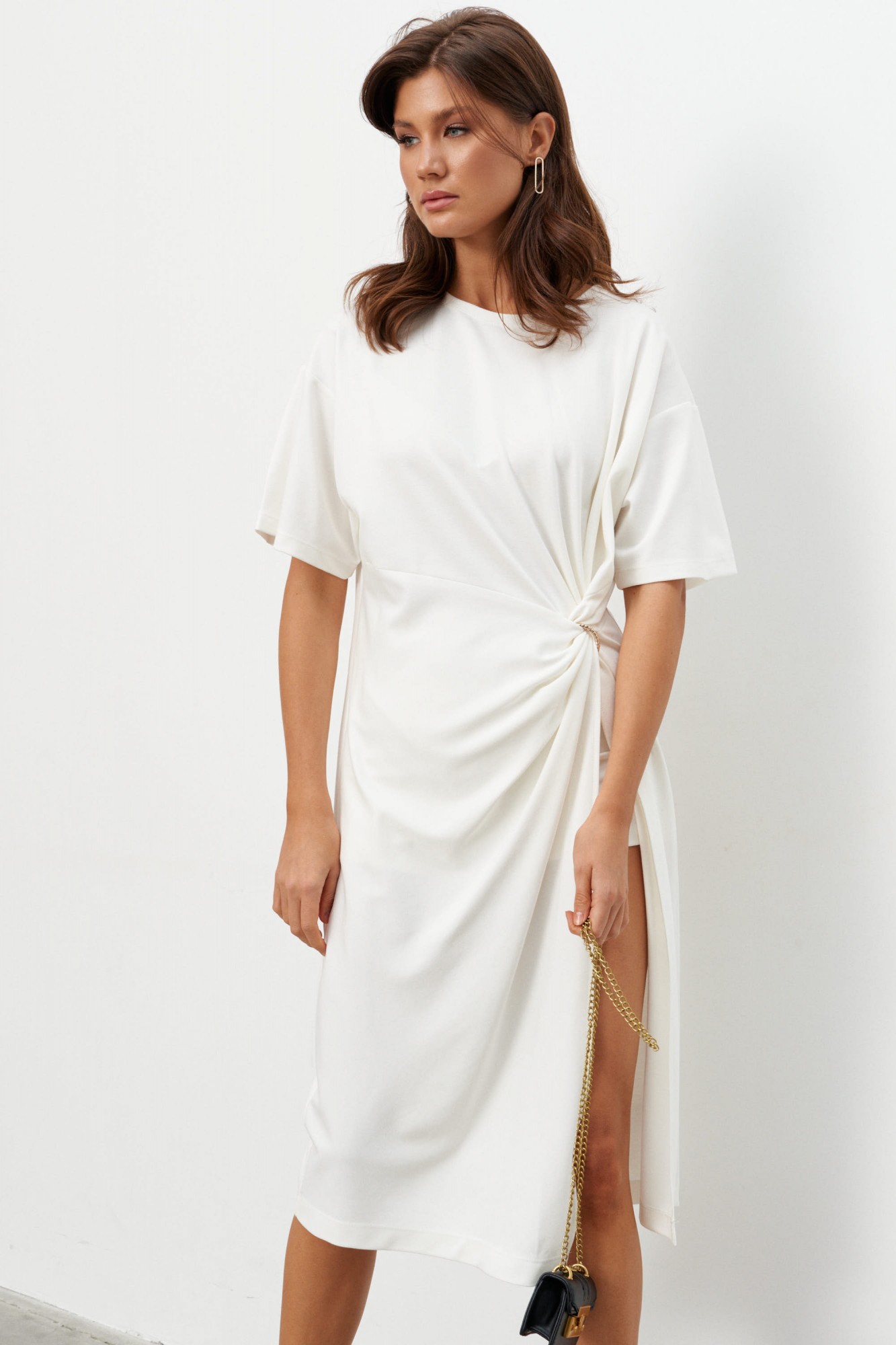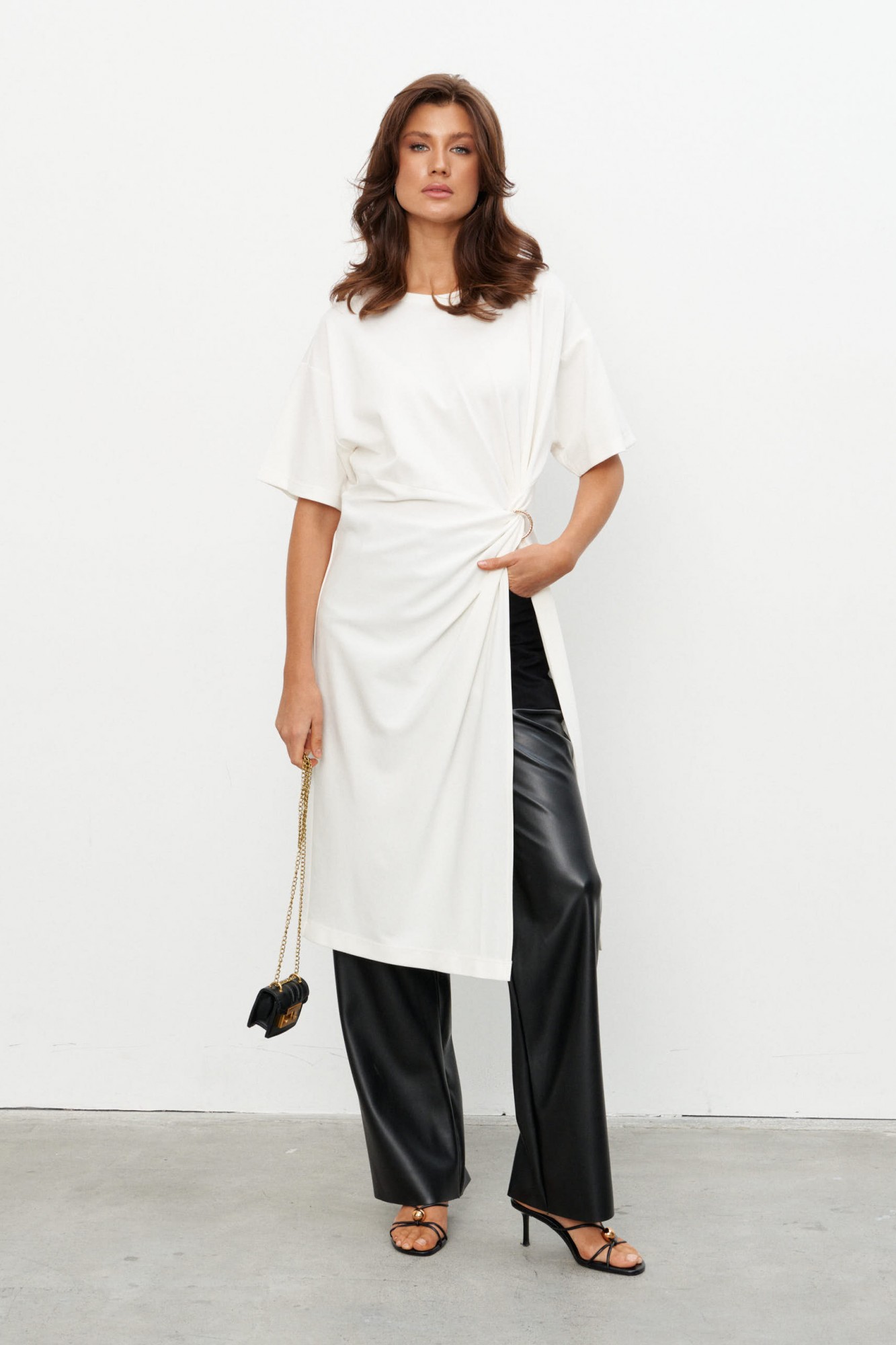 Комплект из трикотажного полотна состоящий из платья-туники и шорт. Платье со спущенным плечом и рукавом до локтя, горловина отделана эластичной бейкой. Сбоку, чуть ниже талии, конструктивный элемент в виде узла, переходящего в высокий разрез. Через узел протянуто декоративное золотое кольцо. Шорты плотно прилегающие на резинке по поясу.
