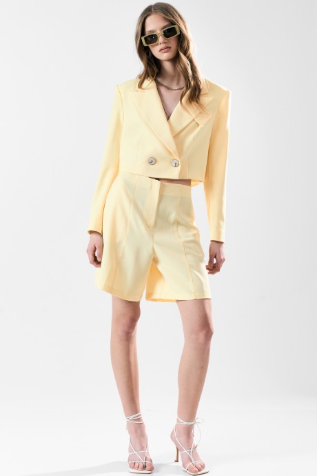 Укороченный двубортный жакет прямого силуэта. Воротник пиджачного типа На левой полочке расположен нефункциональный нагрудный карман, с декоративным элементом в виде сложенного платка. Рукав длинный, втачной, Застежка жакета на прорезные петли и пуговицы. Жакет полностью обработан подкладкой. Длина изделия на 3-4 см ниже линии талии. Шорты бермуды прямого силуэта с посадкой на талии, застежка молния, карманы.