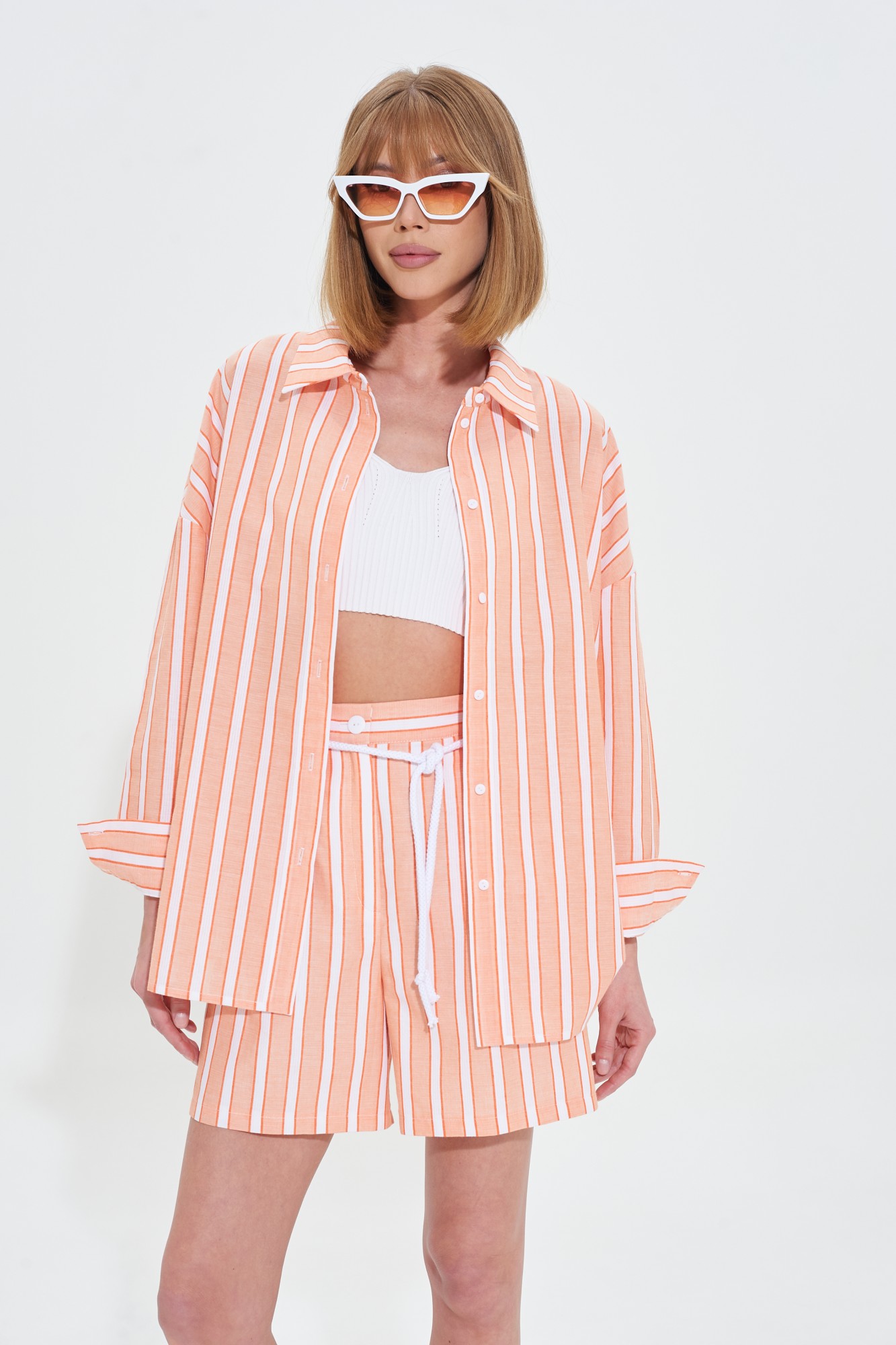 Костюм двойка свободного силуэта. Рубашка с длинным рукавом. Застежка на пуговицы. Шорты со стабильным поясом. В боковых швах карманы. Ремень-шнур в комплекте.