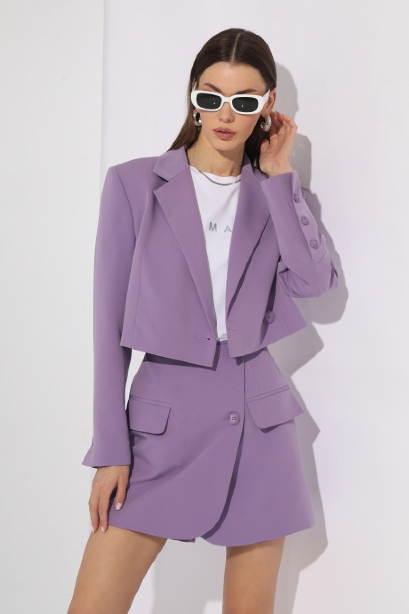 Комплект женский, состоящий из жакета и юбки-шорт. Втачного покроя с двубортной застежкой.