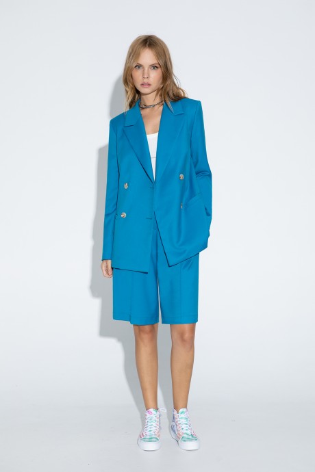 Детали: жакет полуприлегающего силуэта, пиджачный воротник, перед с прорезными карманами, застежка на петли и пуговицы, спинка со средним швом, рукава втачные двухшовные, жакет на подкладке. Шорты с высокой посадкой, притачной пояс с резинкой по спинке, застежка на молнию и пуговицу, боковые карманы