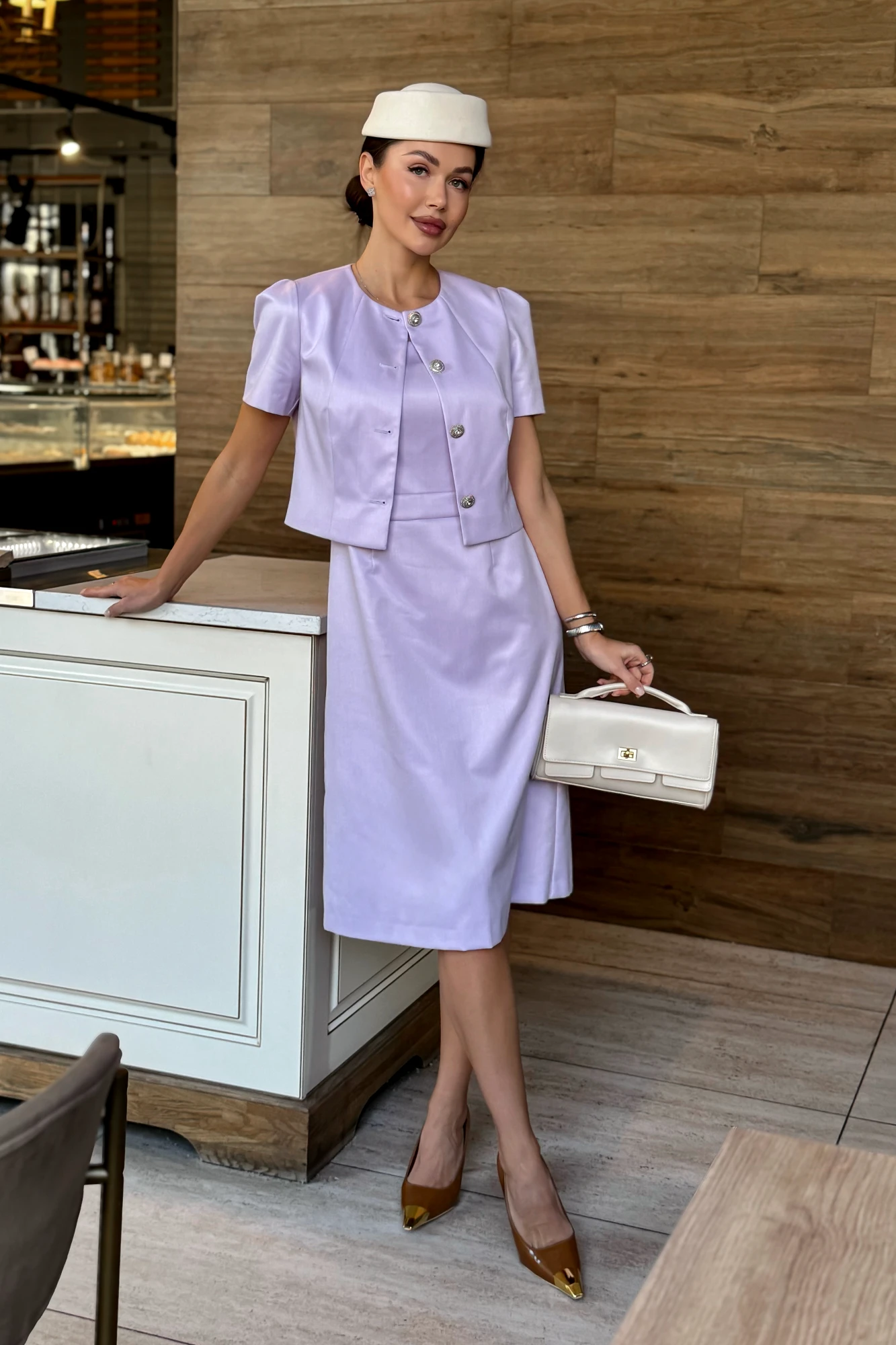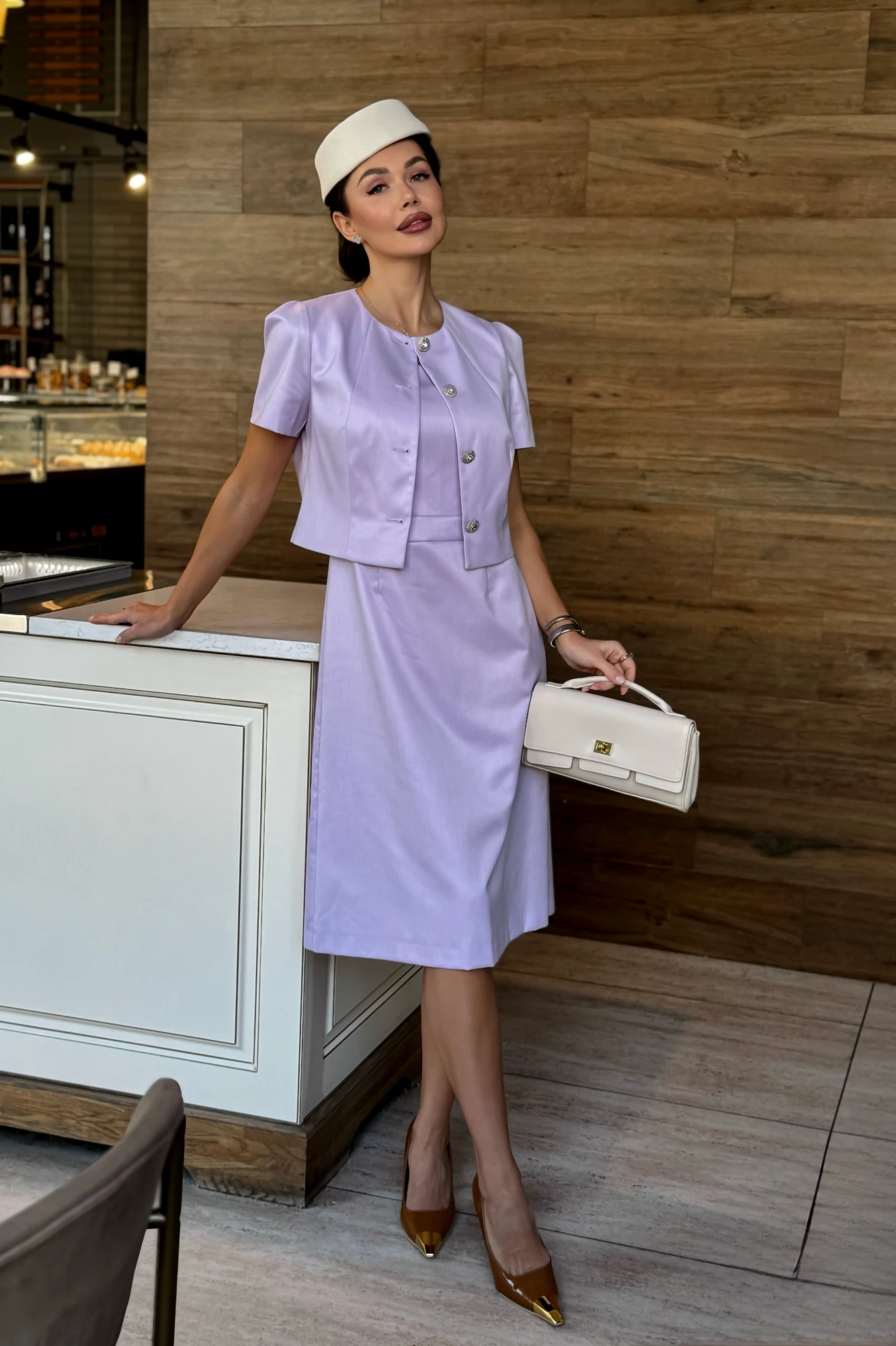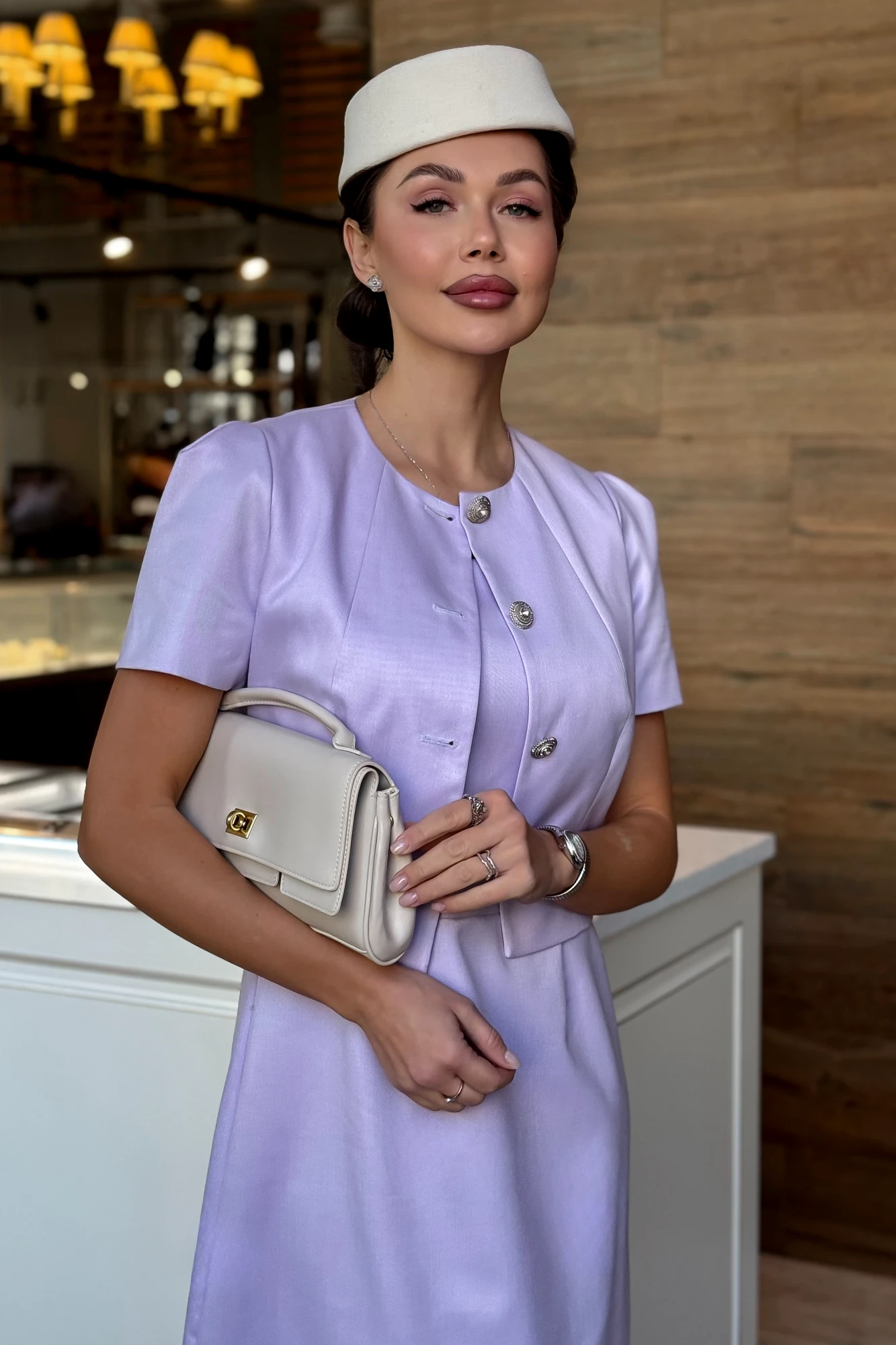 полиэстер - 70%, вискоза - 30%. Состав подкладки жакета: хлопок - 100%. Состав подкладки платья: полиэстер - 100%.