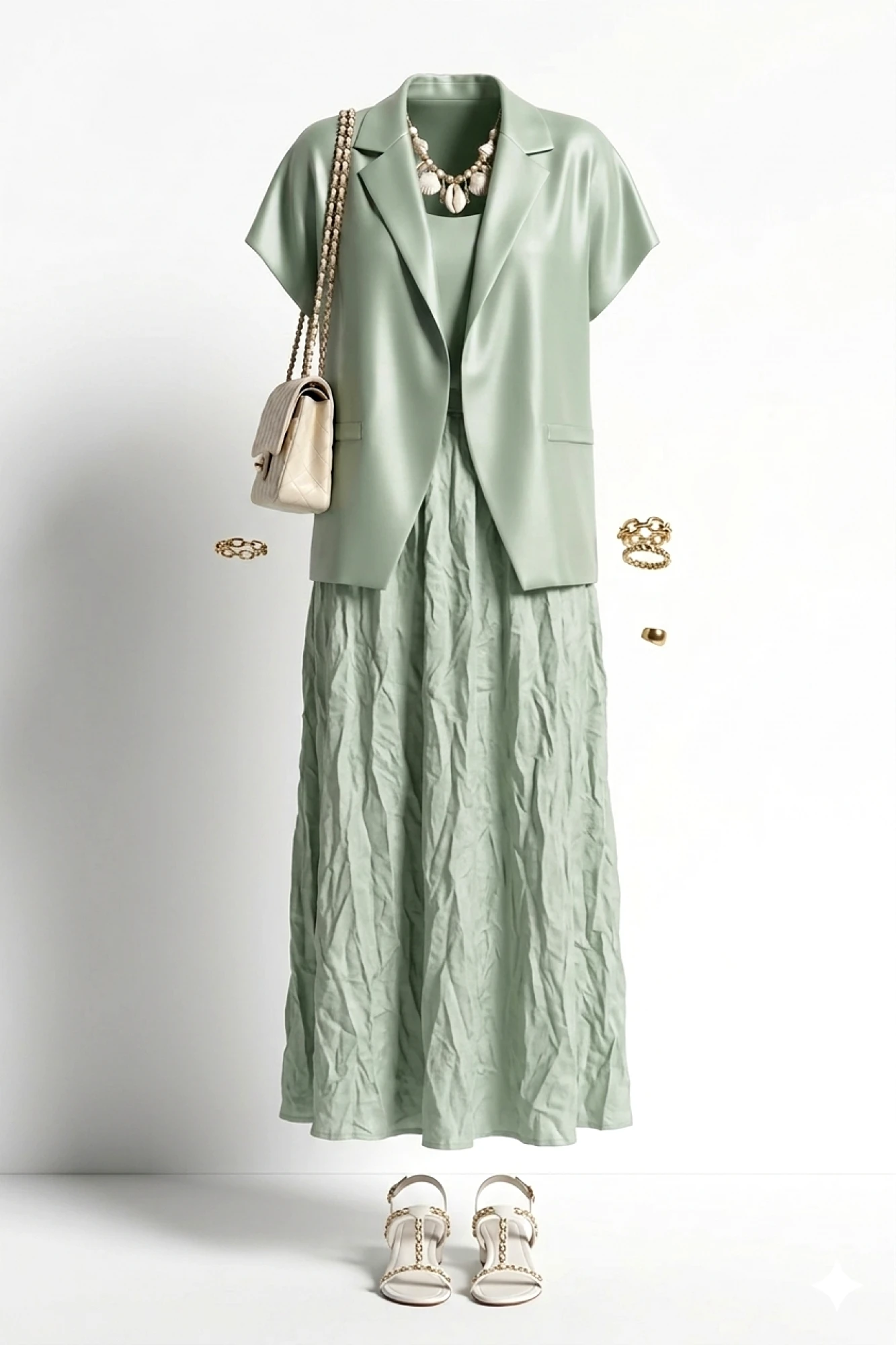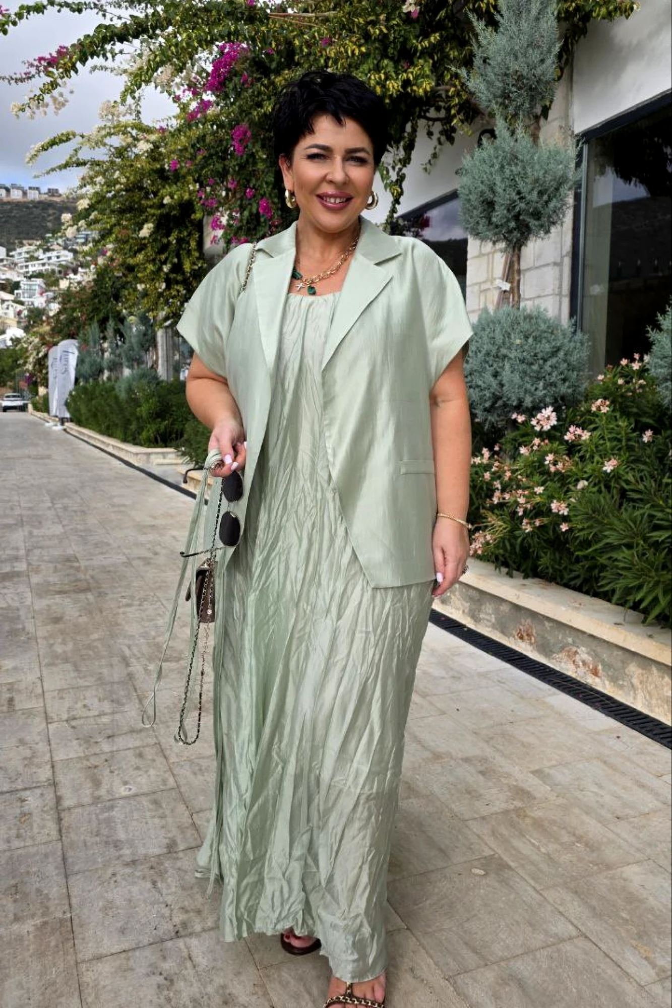 Комплект женский, состоящий из жилета и платья длины «миди» в нежном летнем оттенке. Контраст между гладкостью жилета и фактурностью платья создает визуальную глубину, делает образ интересным для рассмотрения с разных расстояний. Жилет свободного силуэта, на «запах» с фигурной линией борта. Запах — это не просто застежка, он создает динамичную асимметрию — одна сторона накладывается на другую, создавая живую, нестатичную форму. А также игру объемов — в зависимости от того, как завязан жилет, меняется его силуэт. Возможность трансформации — его можно носить плотно запахнутым или свободно, с открытыми полами. Воротник отложной, пиджачного типа. Линия плеча в жилете спущена. По переду жилета декоративные листочки. Спинка со средним швом. В комплекте идёт декоративный пояс из основной ткани. Платье с характерным "мятым" эффектом, который становится главной художественной деталью. Длина миди— золотая середина между скромностью и смелостью, позволяет свободно двигаться. Мятый эффект это не небрежность, а тщательно продуманный художественный прием. Она добавляет тактильности — хочется прикоснуться, ощутить эту "живую" текстуру, смягчает силуэт — делает образ менее формальным, более человечным. Платье длины миди с плавным едва уловимым V-образным вырезом декольте, на регулируемых бретелях. По спинки вставка эластичной тесьмы-резинки, что обеспечивает максимально удобное прилегание. Платье на подкладке.