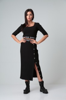 Костюм женский: топ и юбка. Топ из трикотажного полотна длиной до талии. Рукав втачной одношовный длиной до локтя. Горловина "каре". По низу декоративная эластичная тесьма. Юбка прямая удлинённая с застёжкой по левой стороне с декоративными пуговицами. По талии декоративная эластичная тесьма.