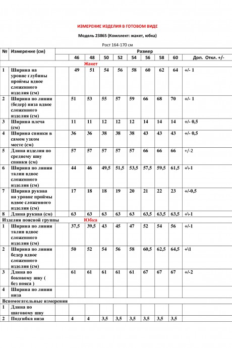 Костюм, состоящий из жакета и юбки. Жакет полуприлегающего силуэта на подкладке с рельефами по переду и спинке, рукав двухшовный, вырез горловины-фигурный. Застежка центральная бортовая на обтяжные пуговицы. Юбка на подкладке, зауженная к низу с притачным поясом и на резинке в размерах 50-60 , без пояса в размерах 46,48. Застежка в юбке на потайную тесьму-молнию в среднем шве заднего полотнища и шлицей. Костюм отдекорирован строчкой-имитацией ручного стежка и съемной брошкой-цветком из пластика.