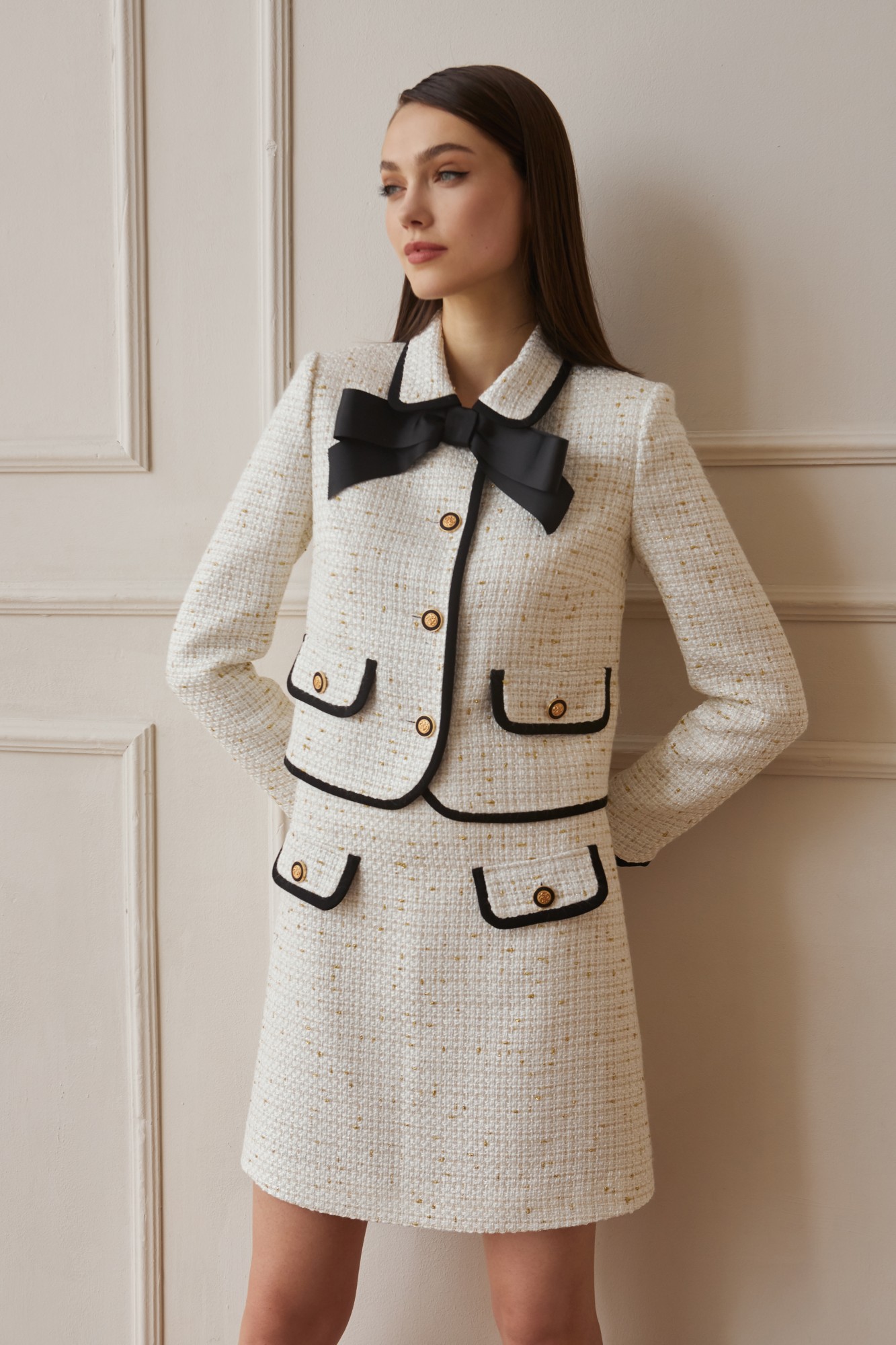 сантиметра. Жакет на подкладке. На уровне верхней пуговицы съёмный бант-брошь.