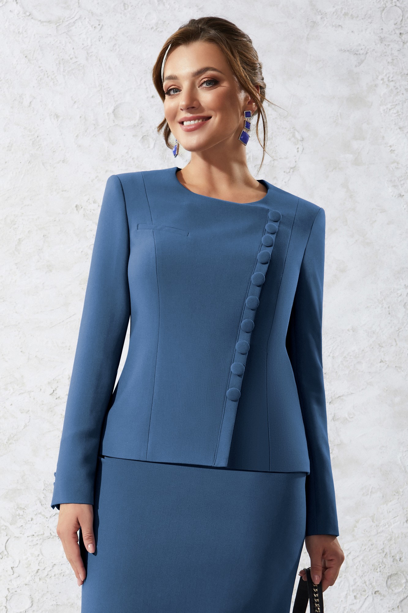 Дизайнерский юбочный костюм полуприлегающего силуэта в минималистичном стиле. Жакет с асимметричной застёжкой на кнопки и декоративные пришивные пуговицы по отрезной планке. Изделие с округлым вырезом горловины. Перед с двумя рельефами и декоративной листочкой в верхней части. Спинка со средним швом и двумя рельефами. Рукава втачные с обтачной шлицей . Юбка карандаш средней посадки на обтачке. Заднее полотнище со средним швом, со складками в нижней части и потайной молнией в среднем шве. Жакет и юбка на подкладке.