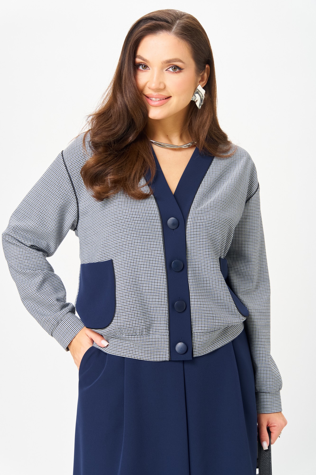 Этот костюм — воплощение интеллектуальной элегантности. Мягкий светло-серый кардиган с коричневыми кантами и крупными пуговицами создаёт образ уютного шарма. V-образный вырез визуально вытягивает шею, а контрастные детали подчёркивают чёткость линий. Рукав на спущенной пройме с манжетой по низу. По переду накладные карманы с декоративной нашивкой. Коричневая юбка миди с глубокими встречными складками и разрезом по переду добавляет образу женственности. В боковых швах карманы. Юбка на подкладке. Для максимально комфортной посадки по бокам пояса вставлена эластичная резинка. Сочетание мягкого верха и строгого низа создаёт баланс между комфортом и аккуратностью, делая комплект универсальным для офиса, повседневных выходов и стильных деловых встреч.