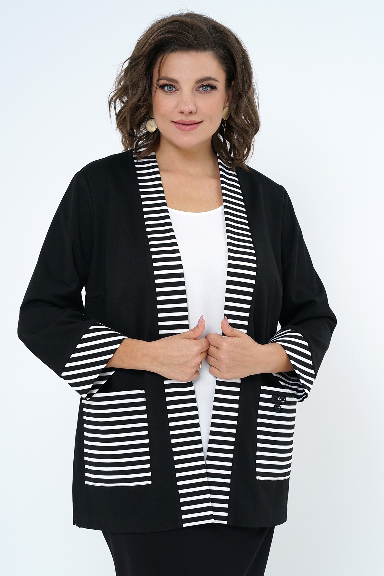 Кардиган прямого силуэта, распашной без застёжки, по боковым разрезы. Перед с нагрудными выточками и накладными карманами (левый декорирован нашивкой). Рукава втачные, одношовные, длиной ¾, понизу с притачными манжетами.