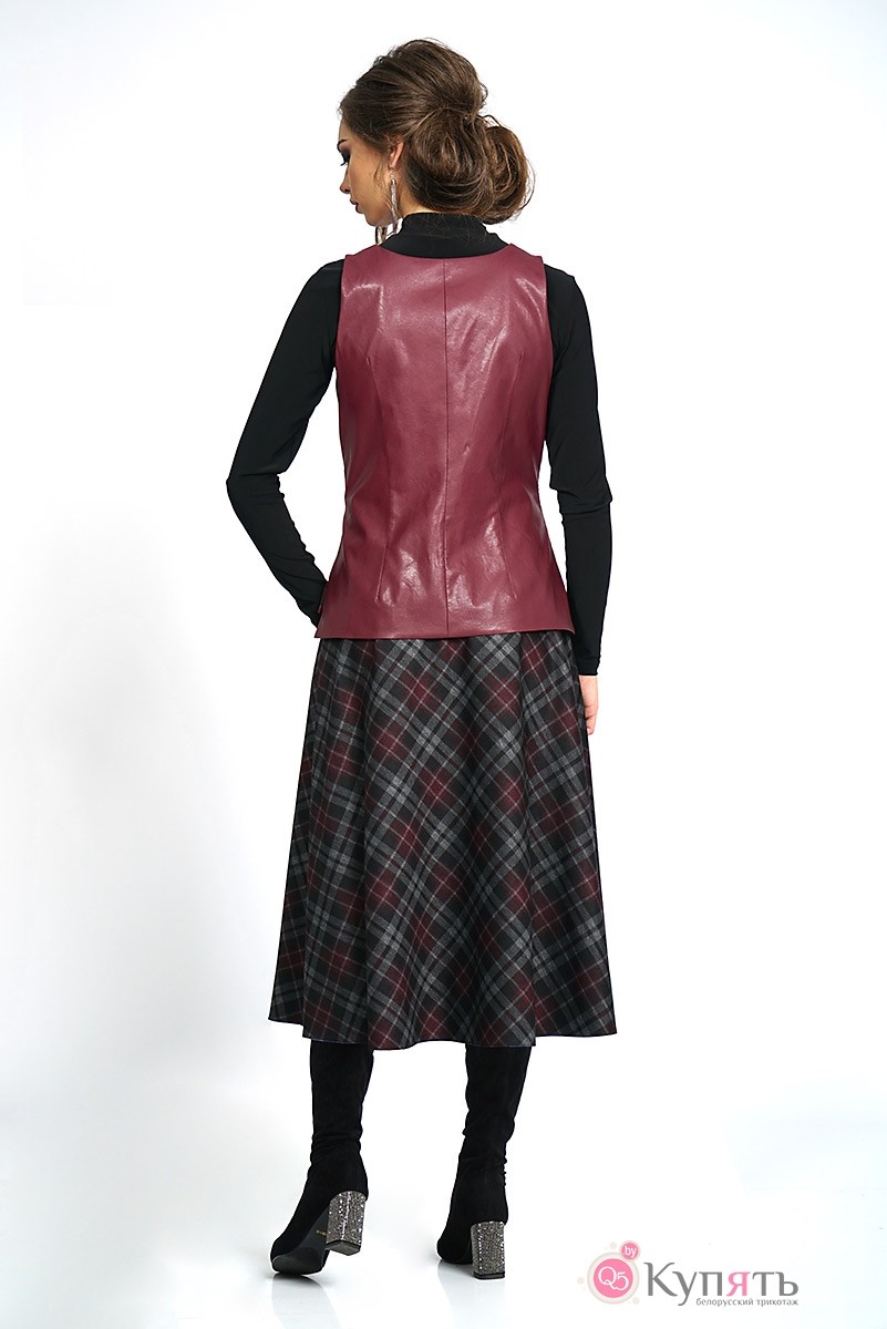жилет:"кожа" вискоза 84%, пэ 16%, покрытие пэ 100%; блуза: трикотаж-масло пэ 95%, спандекс 5%; юбка: трикотаж пэ 70%, вискоза 26%, эластан 4%