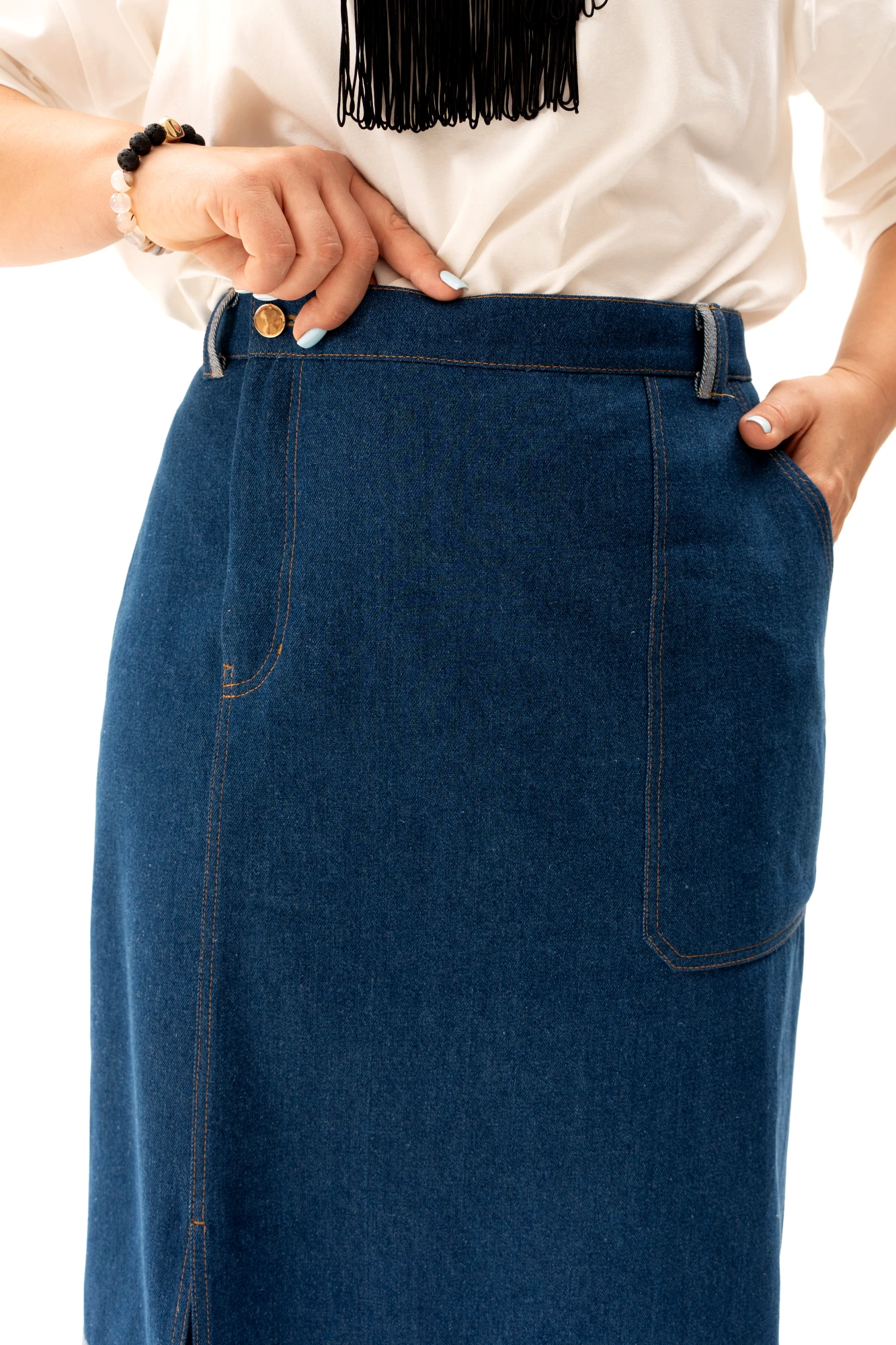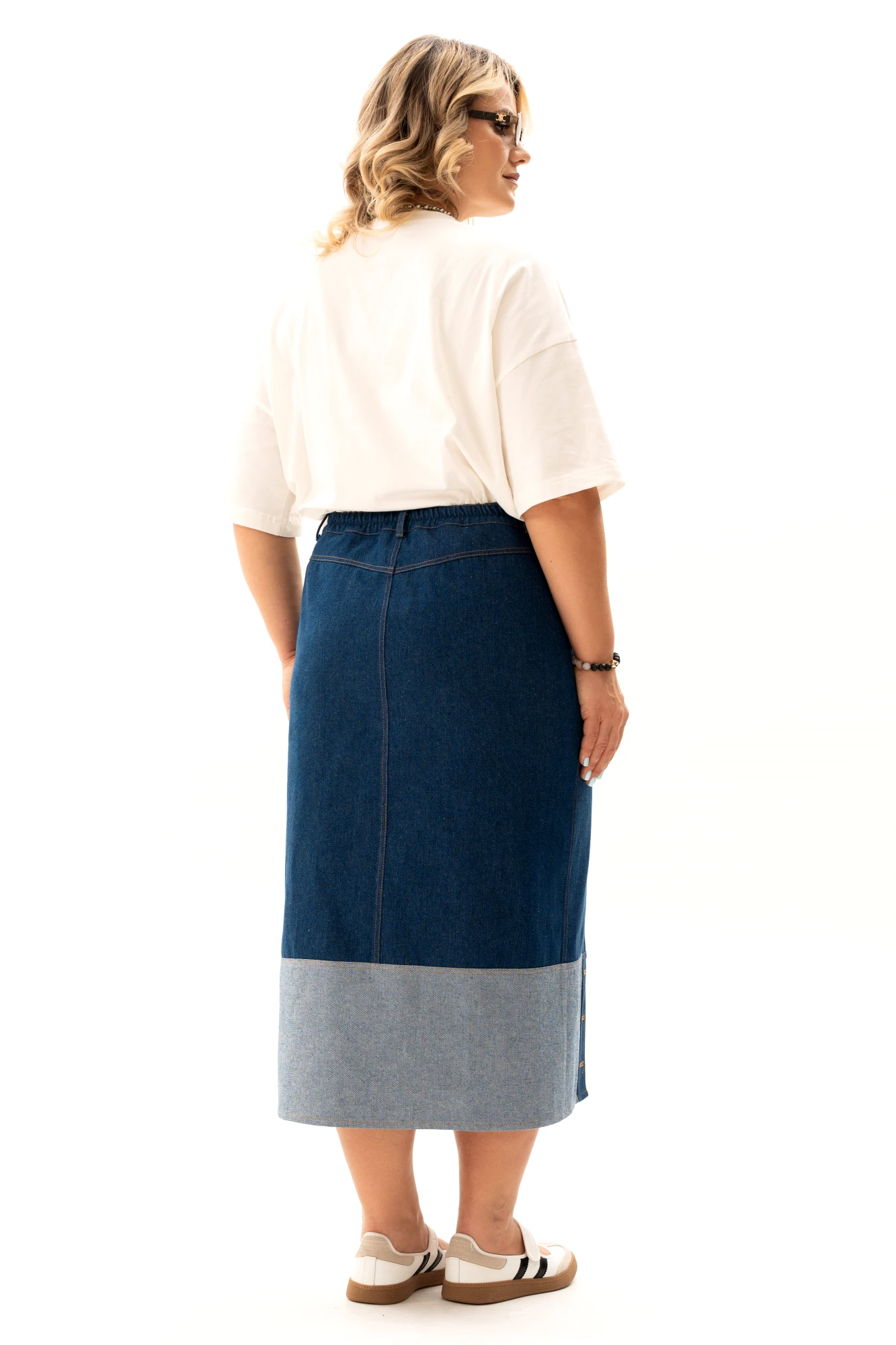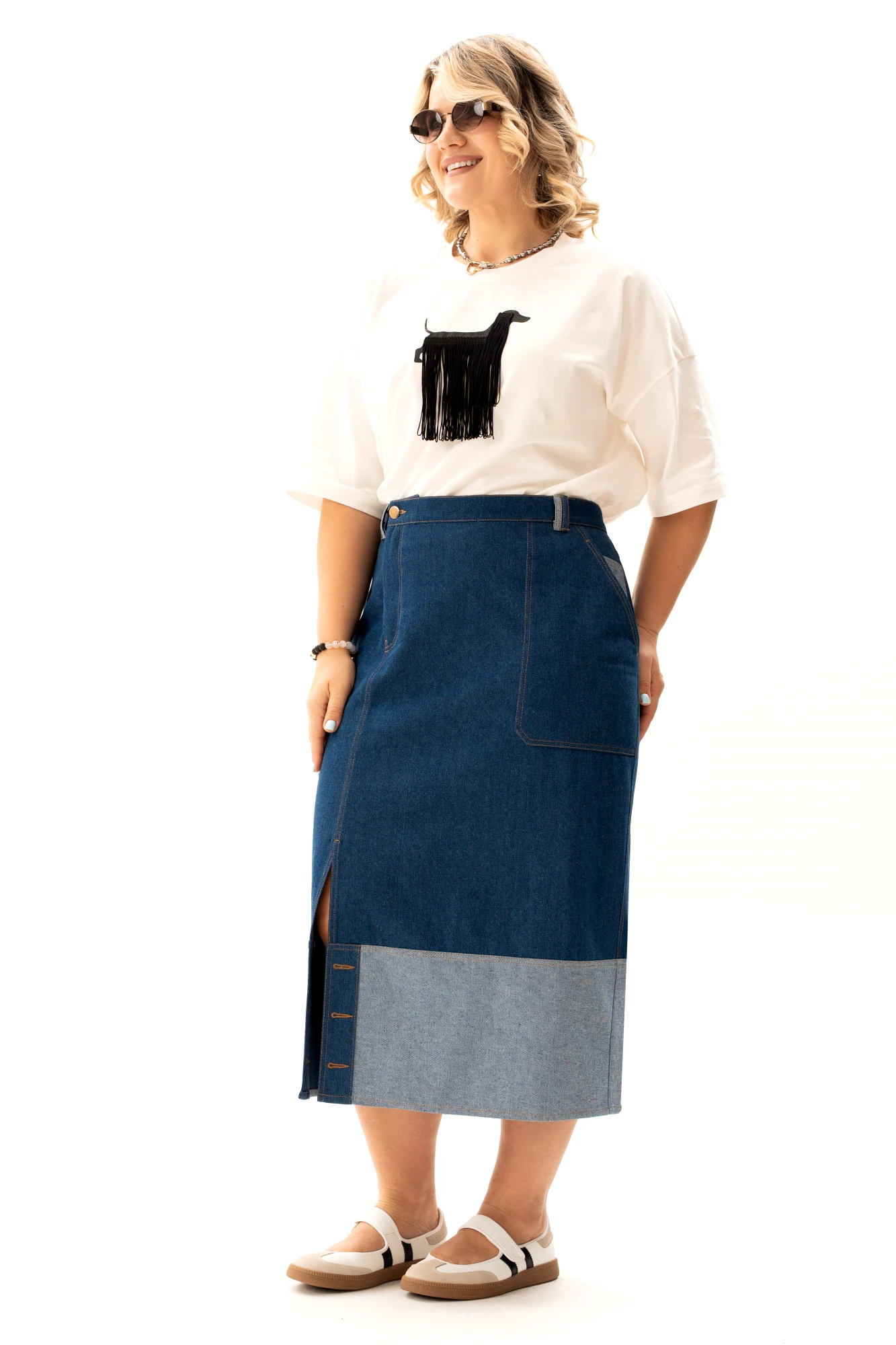 Предлагаем Вам комплект, состоящий из блузки и джинсовой юбки. Блузка из тонкой и легкой ткани из хлопка с добавлением эластана, идеально подойдет для жаркого летнего дня, так как отлично пропускает воздух. Эта блузка с печатью в виде собаки станет отличным дополнением к вашему гардеробу, подчеркнет ваш индивидуальный стиль и добавит нотку стильной элегантности. Джинсовая юбка-предмет одежды на все времена, это базовая вещь в гардеробе, которая отлично сочетается с разными стилями и подходит для любого возраста. Эта юбка — воплощение интеллектуального кэжуала. Выполнена из высококачественного джинса - очень приятна к телу. Главные особенности модели: двухцветный дизайн с контрастным светлым подолом, который визуально облегчает силуэт, притачной пояс со шлевками, функциональные накладные карманы и оригинальная застежка-гульфик, смещенная в сторону. Асимметричная планка с пуговицами и смещенная вправо застежка добавляют образу динамики и делают привычный деним ультрамодным. Комплект уникален в том, что и блузку и юбку можно сочетать с другими элементами из Вашего гардероба. Благодаря разнообразию вариантов комбинирования, вы будете выглядеть модно и стильно в любой ситуации. Идеально для тех, кто ценит комфорт без потери стиля - выглядеть модно, но при этом быть свободными в движениях. Комплект предназначен для создания разных силуэтов и позволяет экспериментировать с образами. Отлично подходит для работы, прогулок или вечернего выхода. Идеальный выбор для тех, кто ищет базу с характером.