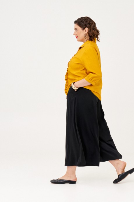 Эффектный женский комплект состоит из блузки и юбки-брюк. Блузка полуприлегающего силуэта со спущенной линией плеча. Рукав 3/4, свободный, заканчивается манжетой без застежки. По переду застежка планка на петли и пуговицы, рюша. Воротник на отрезной стойке. Низ блузки фигурной формы. Юбка-брюки расклешена от бедра. Пояс притачной, резинка застежка сбоку на потайную молнию. Внутренние карманы. Декоративное украшение по поясу(цепь).