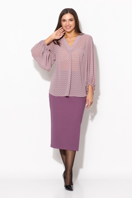 Комплект женский 2-предметный (блузка и юбка). Блуза из шифоновой ткани, полуприлегающего силуэта. По полочке идет нагрудная вытачка из бокового шва. Вырез V-образной формы с планками и складкой по центру. По спинке средний шов, рукав объемный, по окату сборка. Низ рукава фигурный, на резинке. Юбка зауженная к низу, по полочке по линии колена - шлица. По спинке: средний шов, молния, пояс отрезной с резинкой.