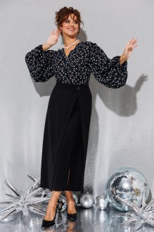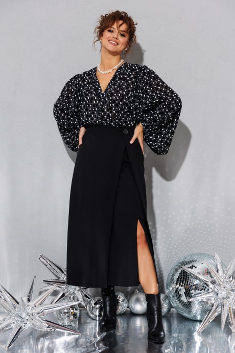 Комплект женский 2-хпредметный (блузка, юбка). Блузка из вискозной ткани полуприлегающего силуэта. По полочке идет нагрудная выточка из бокового шва. Вырез V-образной формы с планками и складкой по центру. По спинке средний шов, рукав объёмный, по окату сборка. Низ рукава фигурный, на резинке. Юбка А-силуэта из текстильной ткани. Пояс на обтачке. По переду юбка двойная. Верхний слой: запах в виде косых подрезов, начинающихся от пояса; нижний слой с подрезом по линии колена, переходящим в разрез. В качестве декора пуговица. По спинке средний шов с молнией.