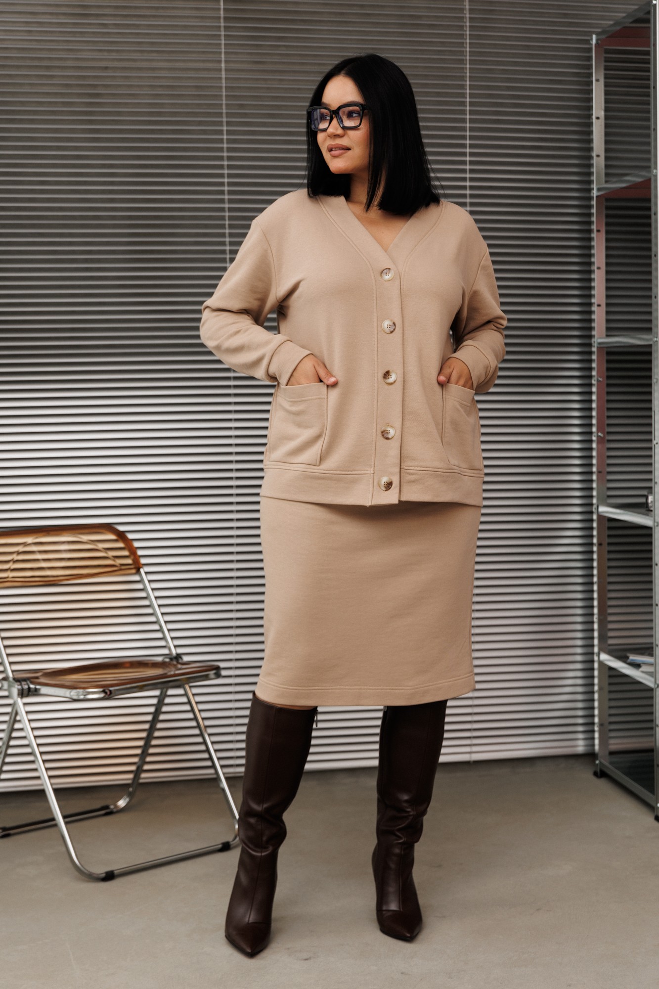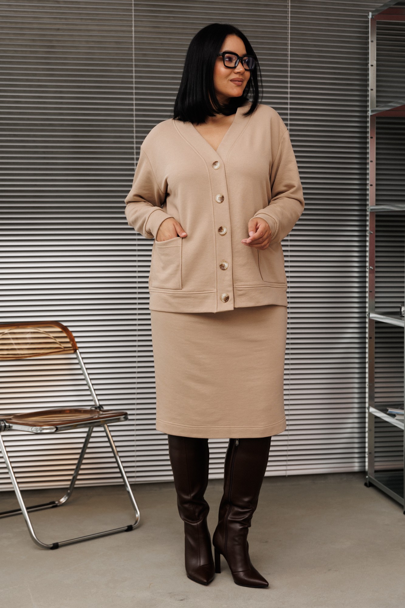 Шикарный трикотажный женский костюм от бренда Anastasia, идеальный для любого случая. Этот костюм сочетает в себе элегантность и комфорт, что делает его подходящим как для деловых встреч или прогулок. Комплект состоит из кардигана и юбки. Кардиган прямого силуэта со спущенным плечом. По низу спинки и полочки идет отрезной пояс. Застежка- планка с пуговицами. По полочке идут накладные карманы. По низу рукава- манжет. Юбка зауженная к низу по спинке идет разрез, пояс отрезной на резинке. Стильный костюм отлично подойдет для долгих прогулок или для работы, для офиса. Юбка -миди создает чувственный образ благодаря своей длине, придающей женственность и элегантность вашему образу. Отдельный части костюма легко будут сочетаться с вещами из Вашего гардероба. Модель можно отнести к стилю спортивный кэжуал, оверсайз, спортивный шик. Костюм можно носить с кроссовками, высокими сапогами или ботинками. Обязательно добавьте наш бренд в избранное и следите за новинками, распродажами, скидками и акциями! Хороших покупок от «Анастасия».