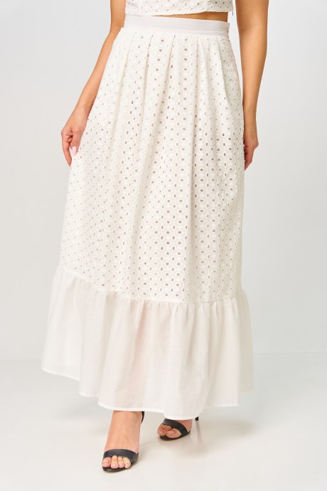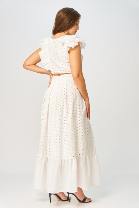 Костюм состоящий из топа и юбки, выполнен из хлопчатобумажной, однотонной ткани “ришелье”. В качестве отделки и подкладки использована однотонная гладкая ткань. Топ прилегающего силуэта, на подкладке. Полочка топа с рельефами и горловиной овальной формы. Спинка топа с вертикальными рельефами. В рельефе с левой стороны обработан волан от низа полки через плечо до низа спинки, в рельефе с правой стороны обработан короткий волан. Воланы топа выполнены из однотонной гладкой ткани. Правая пройма топа по окату обработана воланом. Застежка на потайную молнию в левом боковом шве. Юбка длиной макси на подкладке, с бантовыми складками по талии и наклонными карманами по передним половинкам. В левом боковом шве обработана потайная молния. По талии юбка на притачном поясе с эластичной тесьмой по задней части пояса и застежкой на петлю и пуговицу с левой стороны. Низ юбки обработан притачным воланом из однотонной гладкой ткани.