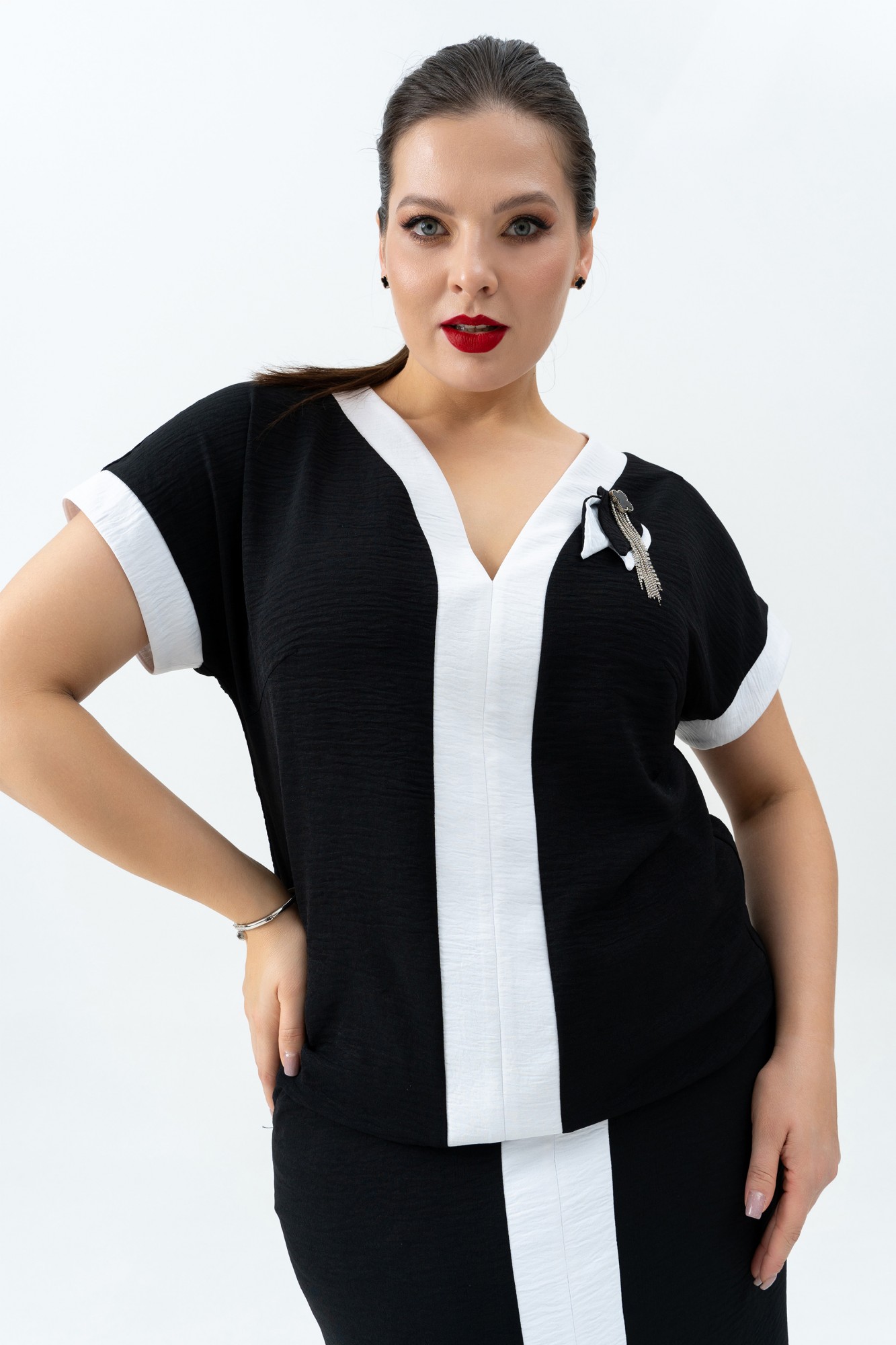 Костюм женский юбочный. Блуза с V-образным вырезом горловины, с декором по полочке, со спущенными рукавами, полочка с нагрудными вытачками, низ блузки на резинке. Юбка с резинкой по спинке и боковым швам пояса. с боковыми наклонными карманами. юбка со вставками по переду.