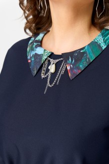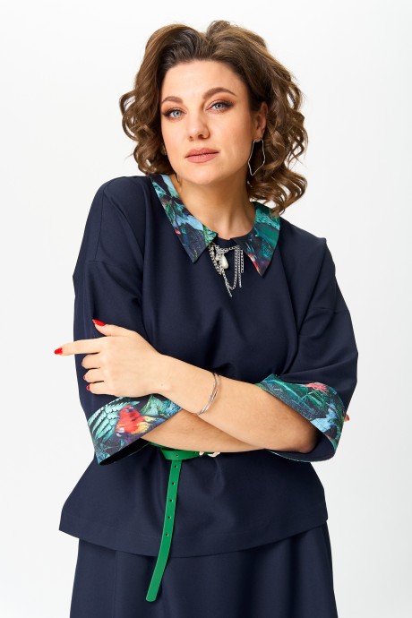 Блузка прямого силуэта, с одношовными рукавами на манжетах из отделочной ткани. Горловина круглой формы с декоративным плосколежащим воротником по переду и дизайнерским съёмным украшением. Прямой крой вещи вытягивает силуэт, скрывает несовершенства и подчёркивает достоинства.