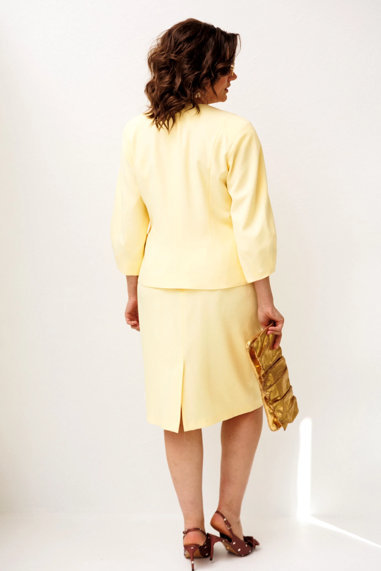 Костюм в нежном желтом оттенке «иволга» звучит спокойно и благородно, создавая образ, в котором сочетаются женственность, лёгкость и уверенная элегантность.
