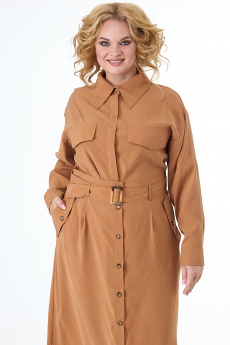 Юбка А -образного силуэта, длины миди, на широком притачном поясе, со шлевками. По переду выполнены боковые карманы с клапанами и функциональная планка на петли и пуговицы. К костюму прилагается пояс с пряжкой из основной ткани.
