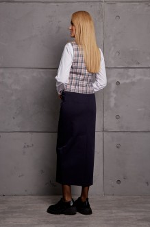 Комплект женский юбочный, состоящий из жилета и юбки. Жилет укороченный, двубортный с отложным воротником с лацканами, по переду и спинке вертикальный рельефы, по переду обманки-клапаны, изделие на подкладке. Юбка прямая, зауженная к низу, со шлицей по заднему полотнищу, застёжка сзади на молнию и пуговицу, на поясе, с боковыми карманами. Изделие на подкладке.
