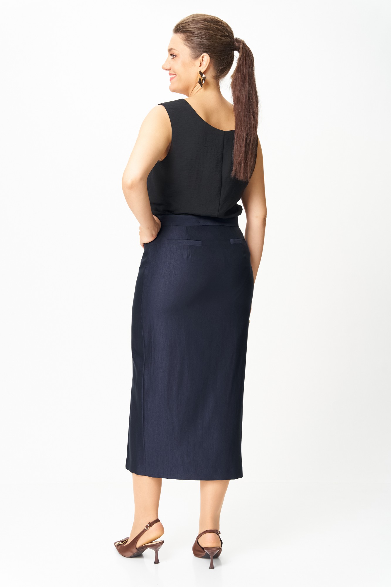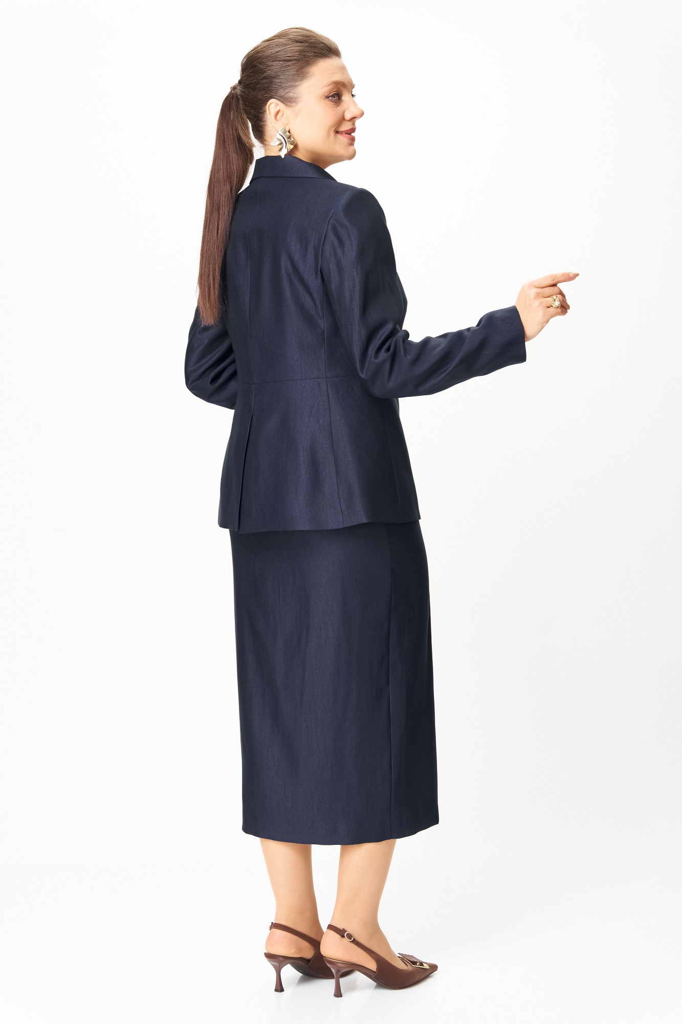 Стильный женский костюм, выполнен в классическом стиле из костюмной ткани с блеском, состоит из жакета и юбки. Жакет полуприлегающего силуэта, отрезной по линии талии, горловина оформлена воротником пиджачного типа с отложными лацканами, застежка по линии талии на кнопки, по краю борта пришита декоративная пуговица. В центральном шве спинки шлица. Рукава втачные. Жакет на подкладке. Юбка прилегающего силуэта, заужена к низу, по переде застрочены рельефные швы, застежка на декоративную молнию по центру переда. Верх юбки на притачной поясе. Юбка на подкладке.