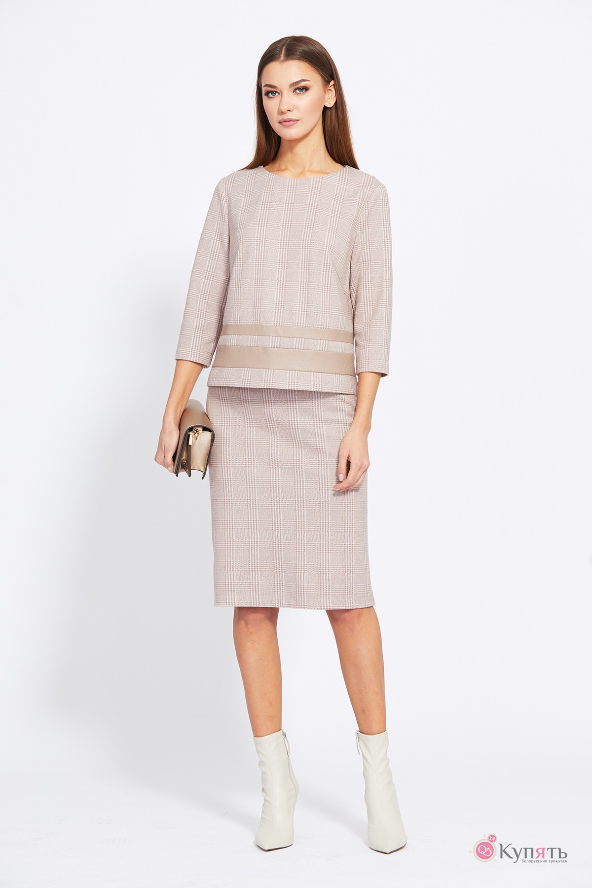 Комплект: блузка+юбка. Комплект выполнен из трикотажного полотна с рисунком "клетка". Блузка прямого силуэта, длиной выше линии бедер. Перед цельный, с двумя горизонтальными вставками из экокожи. Застежка в среднем шве спинки на металлическую молнию. Горловина округлой формы. Рукав втачной, одношовный, длиной 3/4, с локтевой вытачкой. Юбка зауженная к низу, на притачном поясе, длиной ниже линии колена. Застежка сзади в среднем шве на потайную молнию и пуговицу. Сзади в среднем шве обработана шлица.