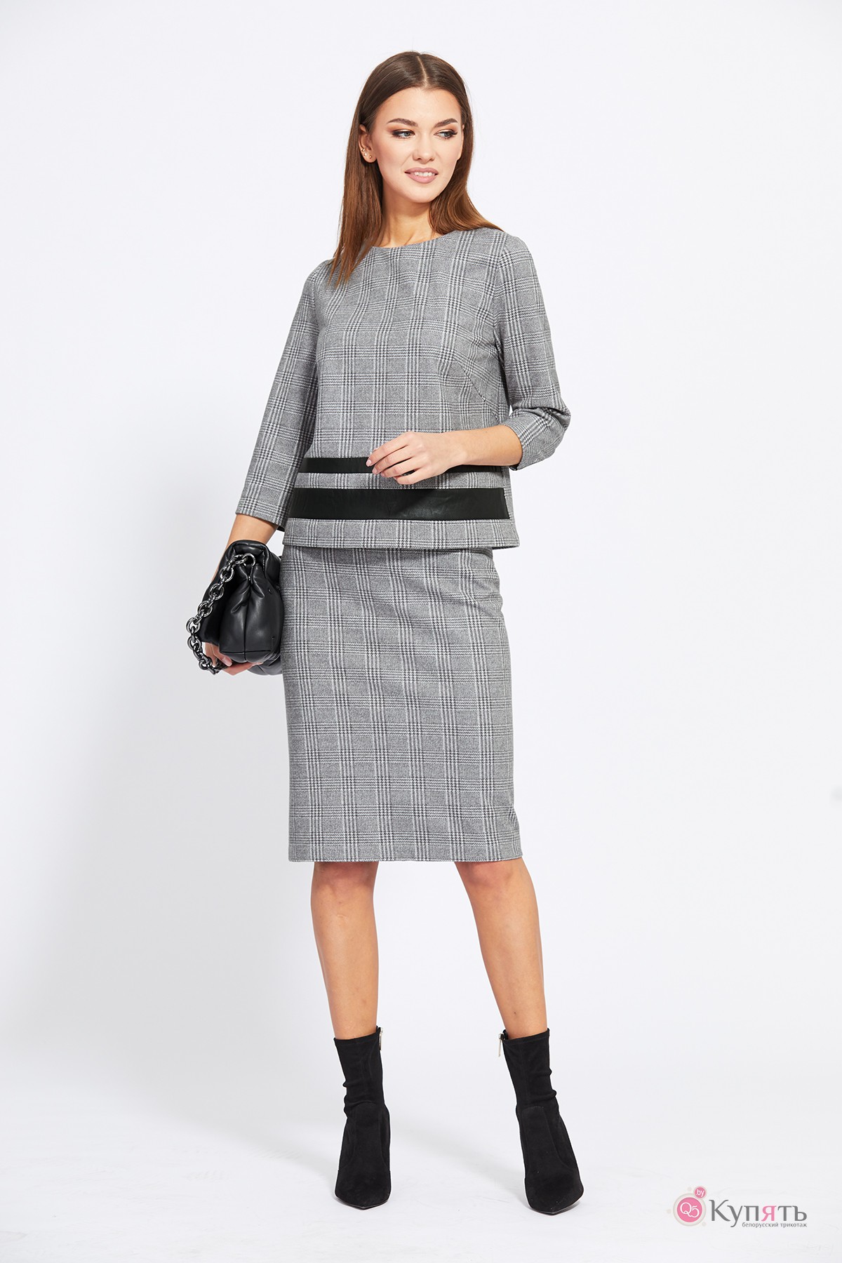 Комплект: блузка+юбка. Комплект выполнен из трикотажного полотна с рисунком "клетка". Блузка прямого силуэта, длиной выше линии бедер. Перед цельный, с двумя горизонтальными вставками из экокожи. Застежка в среднем шве спинки на металлическую молнию. Горловина округлой формы. Рукав втачной, одношовный, длиной 3/4, с локтевой вытачкой. Юбка зауженная к низу, на притачном поясе, длиной ниже линии колена. Застежка сзади в среднем шве на потайную молнию и пуговицу. Сзади в среднем шве обработана шлица.