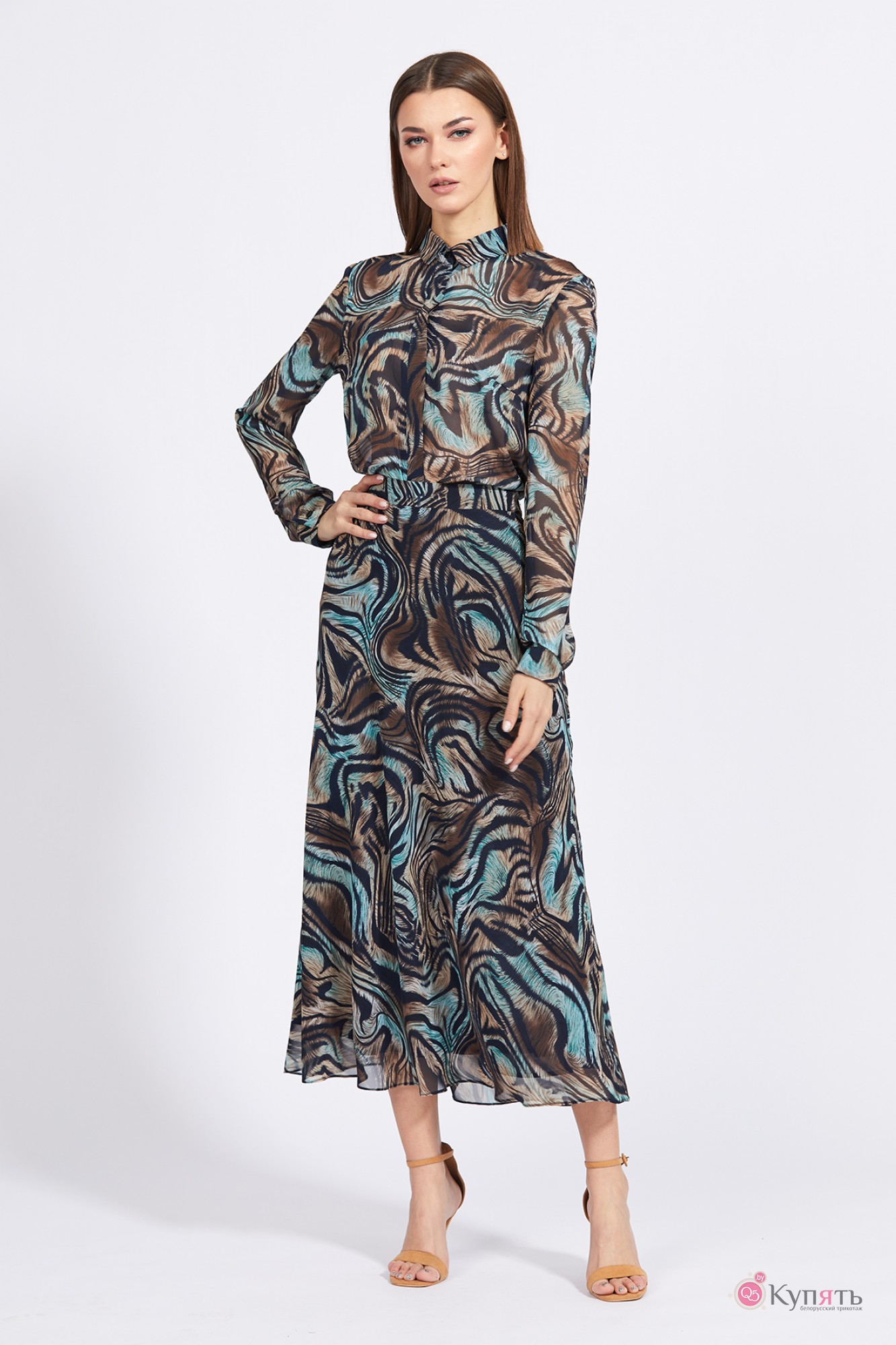Комплект: блузка + юбка. Комплект выполнен из шифона с принтом. Блузка прямого силуэта, длиной до линии бедер. Воротник рубашечного типа. Застежка спереди на пуговицы на потайной планке. Рукав втачной, на манжете. Юбка расширена к низу, длиной миди. Юбка на притачном поясе с эластичной тесьмой, выкроена по косой. Юбка на отлетной по низу трикотажной подкладке.