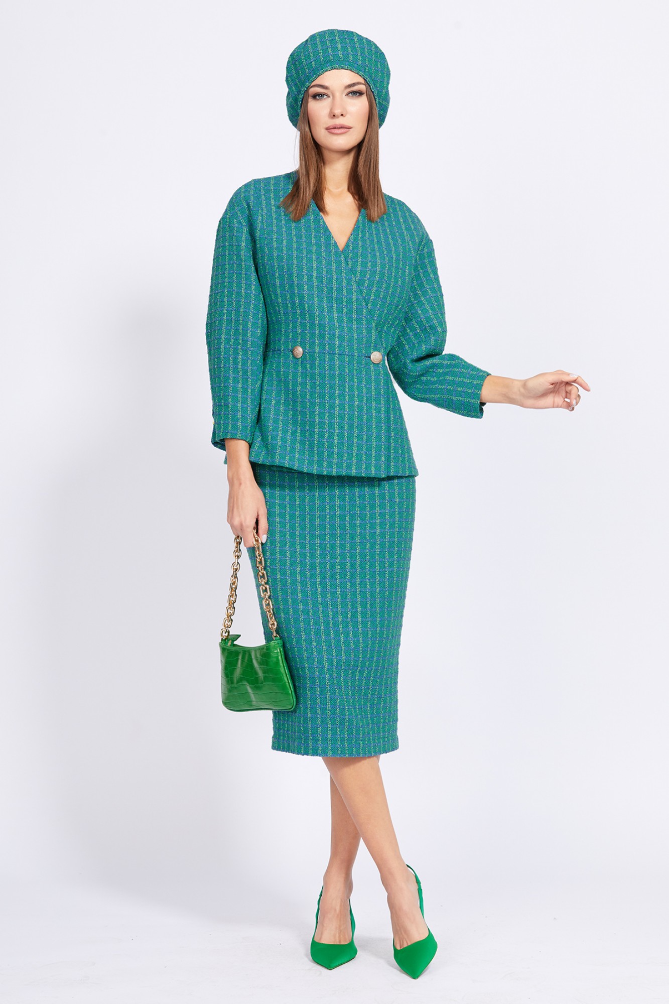 Комплект: жакет + юбка. Комплект выполнен из твида. Жакет полуприлегающего силуэта, отрезной по линии талии, длиной чуть выше линии бедер. Застежка центральная двубортная на две пришивные пуговицы. Горловина переда - V-образной формы. Рукав рубашечного покроя, одношовный, длиной 4/5. Низ рукава заужен. Низ жакета оформлен баской. Жакет на притачной по низу подкладке. Юбка длиной ниже линии колена, на притачном поясе, заужена к низу. Перед цельный. Сзади в среднем шве разрез. Застежка сзади на потайную молнию.