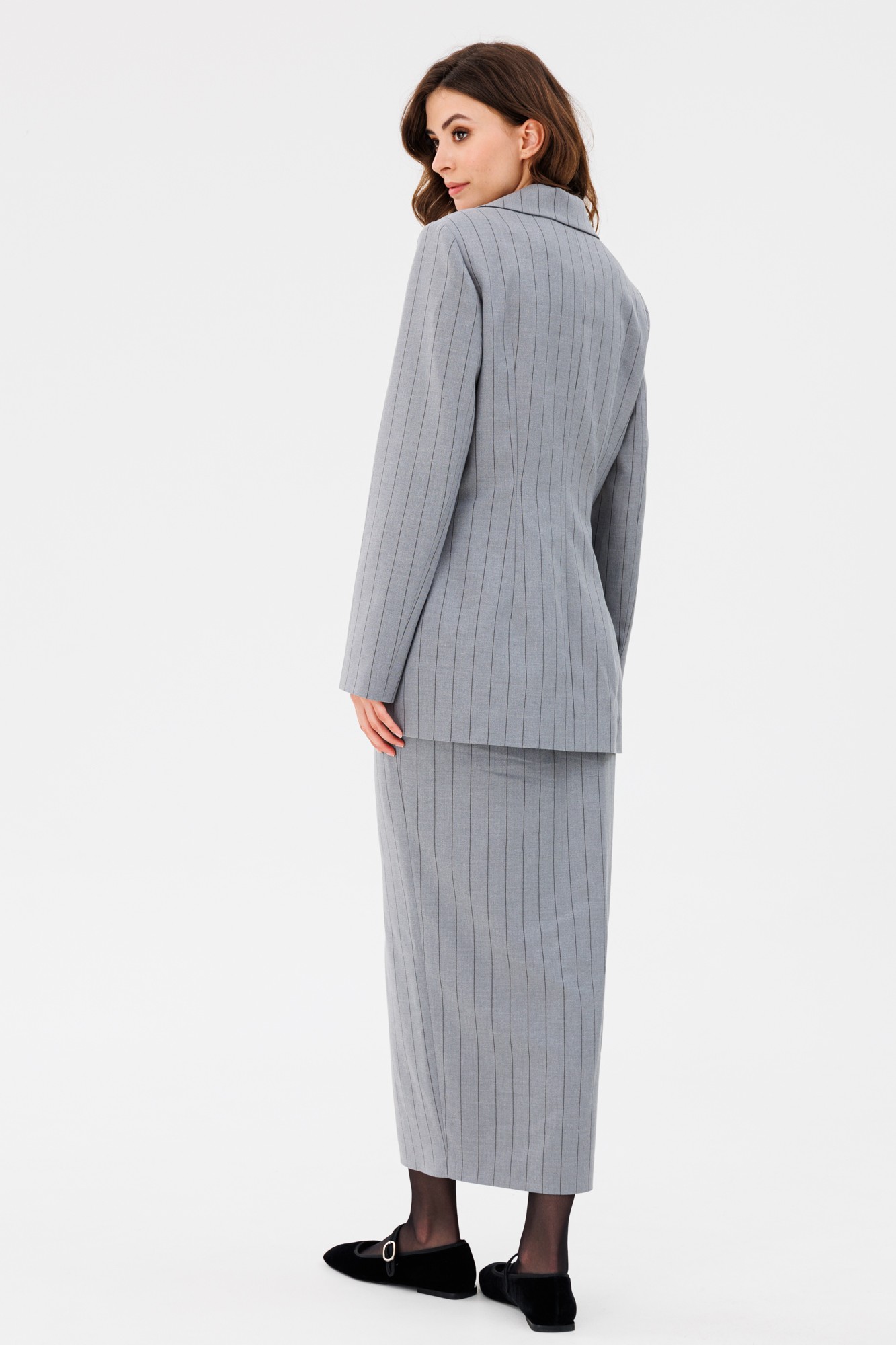 Комплект: жакет + юбка. Комплект выполнен из костюмной ткани в полоску. Жакет полуприлегающего силуэта, длиной до линии бедер. Спереди прорезные карманы. Спереди центральная застежка на пуговицы. На спинке средний шов. Воротник пиджачного типа. Рукав втачной, двухшовный. Жакет на притачной по низу подкладке. Юбка заужена к низу, на притачном поясе, длиной миди. Переднее полотнище состоит из двух частей: верхней и нижней. Нижняя часть выполнена в виде прямой юбки, длиной выше линии колена. На верхней части спереди разрез и декоративная застежка на потайную молнию. Юбка на притачной по низу подкладке.
